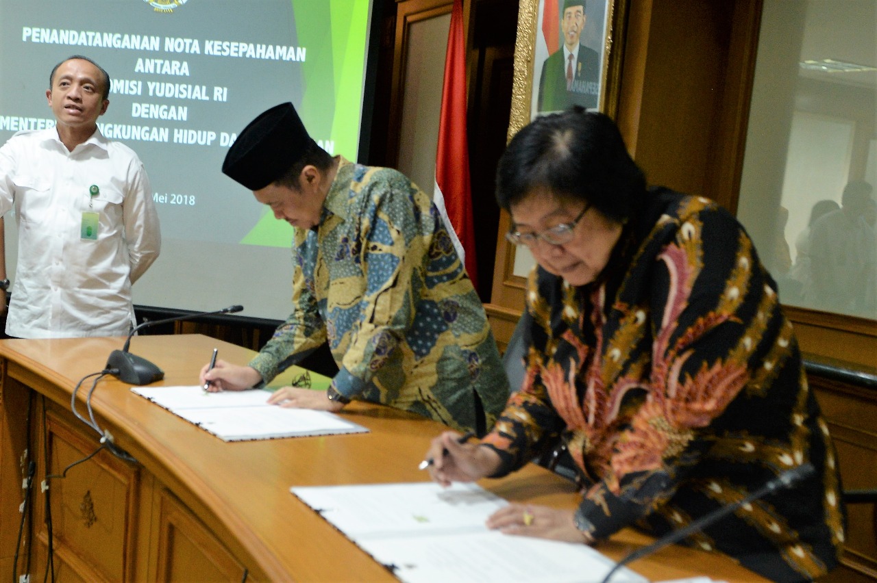 Jakarta, Kementerian Lingkungan Hidup dan Kehutanan (KLHK), Rabu, 23 Mei 2018. Menteri Lingkungan Hidup dan Kehutanaan, Siti Nurbaya dan Ketua Komisi Yudisial (KY), Aidul Fitriciada Azhari, menandatan...