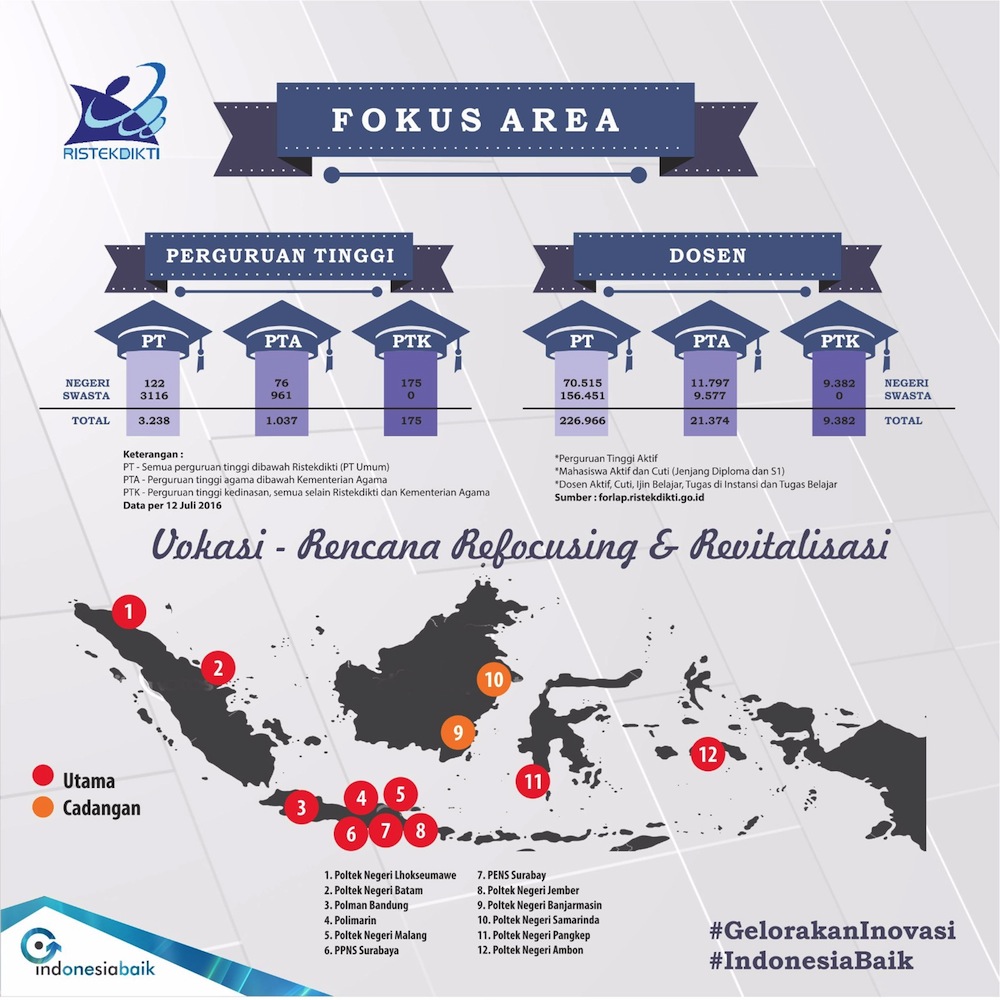 Saat ini kita memasuki era digital, dimana pengembangan dan pemanfaatan teknologi informasi menjadi keharusan dalam fokus-fokus riset kita yang meliputi bidang: pangan, energi, manajemen transportasi, teknologi informasi dan komunikasi, pertahanan dan keamanan, kesehatan dan obat, material maju dan kemaritiman. Perguruan tinggi kita telah banyak menghasilkan hasil-hasil riset pada bidang-bidang tersebut yang disebut sebelumnya, selanjutnya diperlukan kebijakan untuk mensinergikan berbagai stakeholder agar hasil riset tersebut dapat didorong (hilirisasi) menjadi produk inovasi sehingga memberikan kontribusi dominan dalam pembangun perekonomian kita.