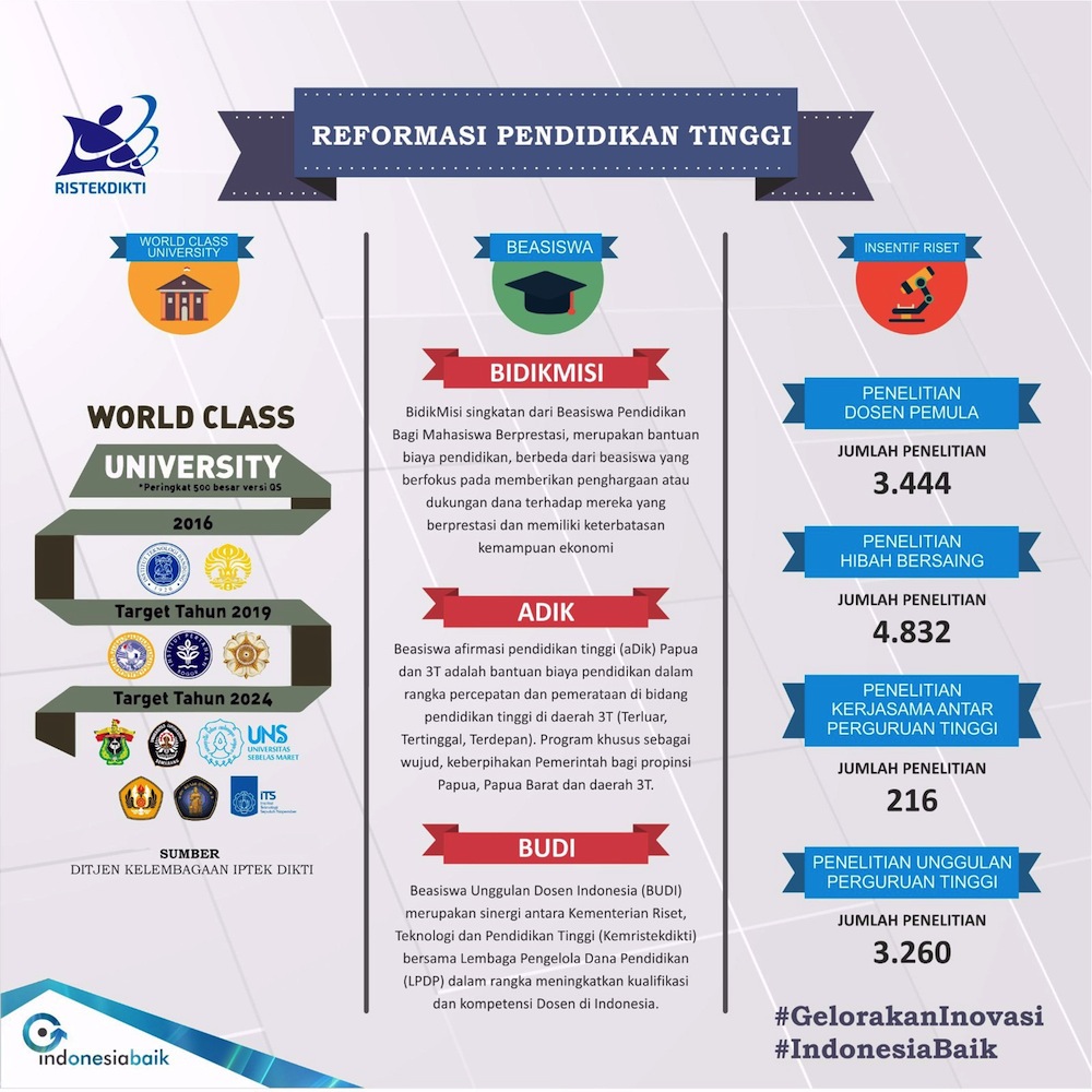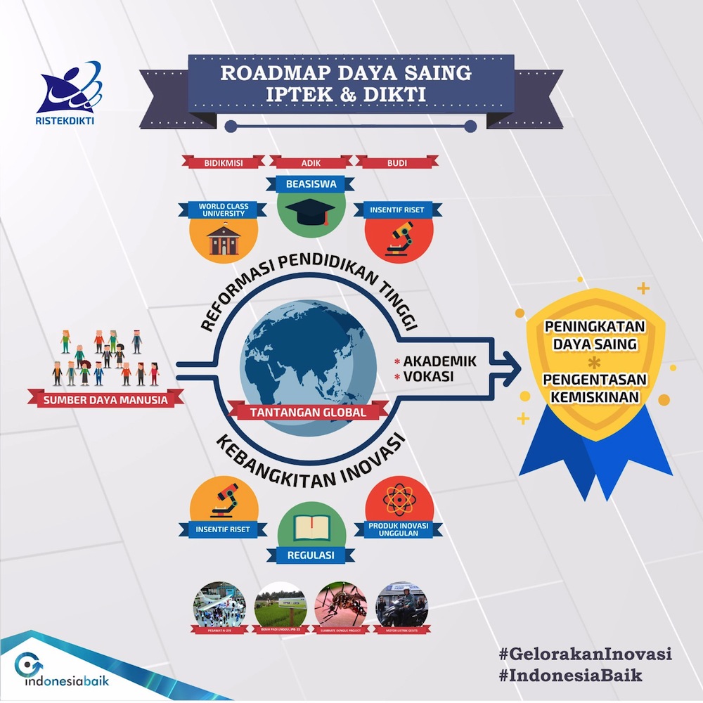 Hingga saat ini Ristekdikti terus berupaya menginisiasi dan menelurkan kebijakan yang menjadi peta jalan (road map) penguatan inovasi nasional, antara lain: pertama akses pendidikan tinggi lewat bantuan program beasiswa (BIDIKMISI, ADIK, PPA, PTS, dll). Berdasarkan data akhir Juni 2016 telah mencapai 369.508 penerima beasiswa. Selain itu juga tercatat dua Universitas masuk top 500 dunia, yaitu ITB dan UI (versi QS). Kedua meningkatkan tenaga terdidik, terampil dan berpendidikan tinggi. Ketiga meningkatkan kualitas pendidikan tinggi dan lembaga litbang, Keempat meningkatkan sumberdaya litbang dan mutu pendidikan tinggi. Kelima meningkatkan produktivitas penelitian dan pengembangan, dan keenam meningkatkan inovasi bangsa. Sebagai contoh Kemrisetkdikti mendorong lahirnya kebijaksaan pemerintah berupa Permenkeu (PMK) No. 106/PMK.2/2016, dimana penggunaan anggaran riset berorientasi pada hasil akhir (output). Kebijakan ini akan memicu para peneliti untuk fokus melakukan aktifitas riset karena tidak dijejali dengan persyaratan administrasi dan laporan pertanggungjawaban yang rumit.