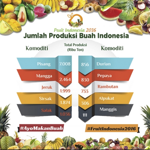 Untuk mengeksplorasi kekayaan buah nusantara dan mempromosikan potensi ekspor mancanegara sebagai bagian Gerakan Revolusi Oranye, Kementerian Pertanian dan Institut Pertanian Bogor (IPB) bersama Kementerian Koordinator Bidang Perekonomian menggelar FRUIT INDONESIA 2016 bertema "Mengembangkan Kapasitas dan Kemampuan Nasional untuk Meningkatkan Ekspor Buah Nusantara, secara Revolusioner" diselenggarakan pada 17 sampai dengan 20 Nopember 2016 di Parkir Timur Senayan, Jakarta Pusat.