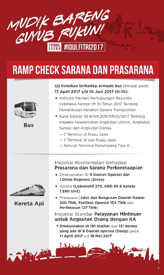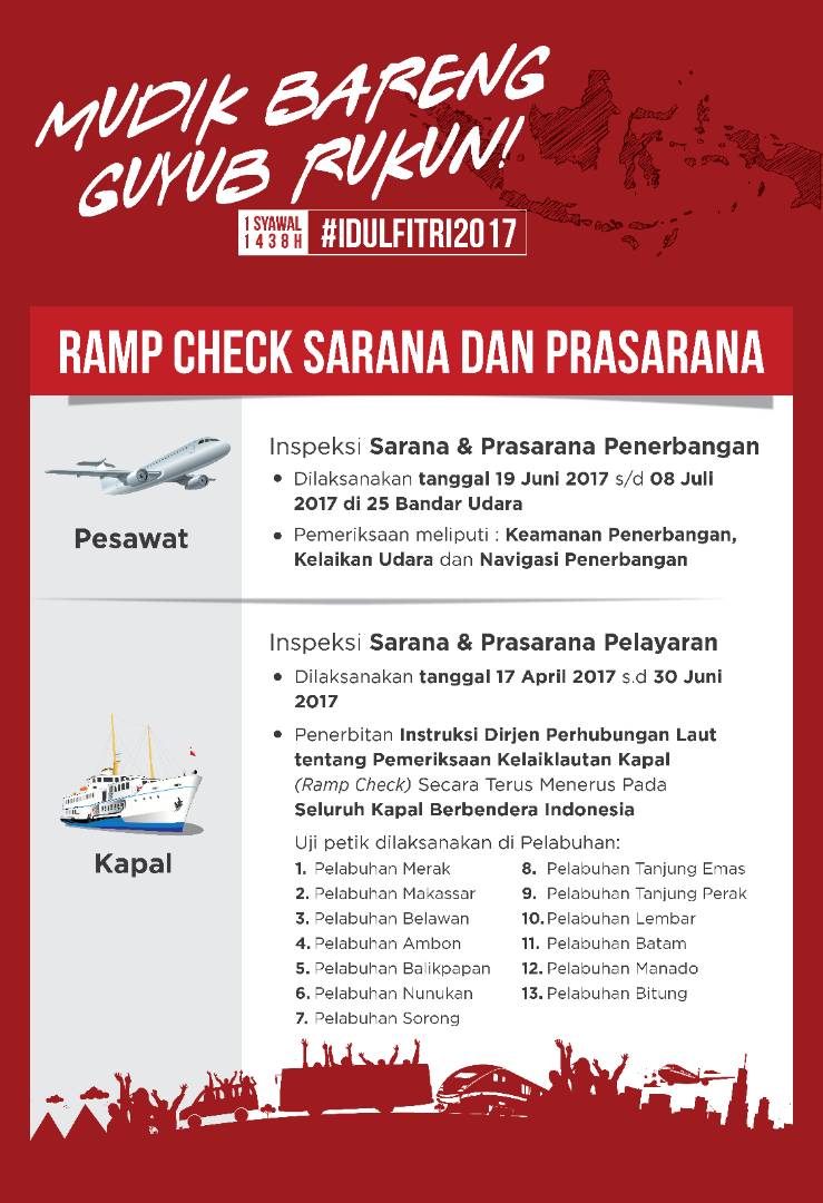 Tidak hanya menambah kapasitas angkutan, Menhub Budi menjelaskan, faktor kelaikan angkutan umum menjadi perhatian utama pihaknya. Untuk itu, Kemenhub telah melakukan pengecekan kelaikan atau ramp chek terhadap seluruh moda transportasi yang disiapkan beroperasi pada masa Angkutan Lebaran tahun 2017.