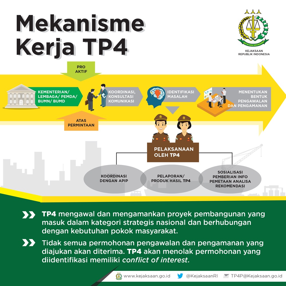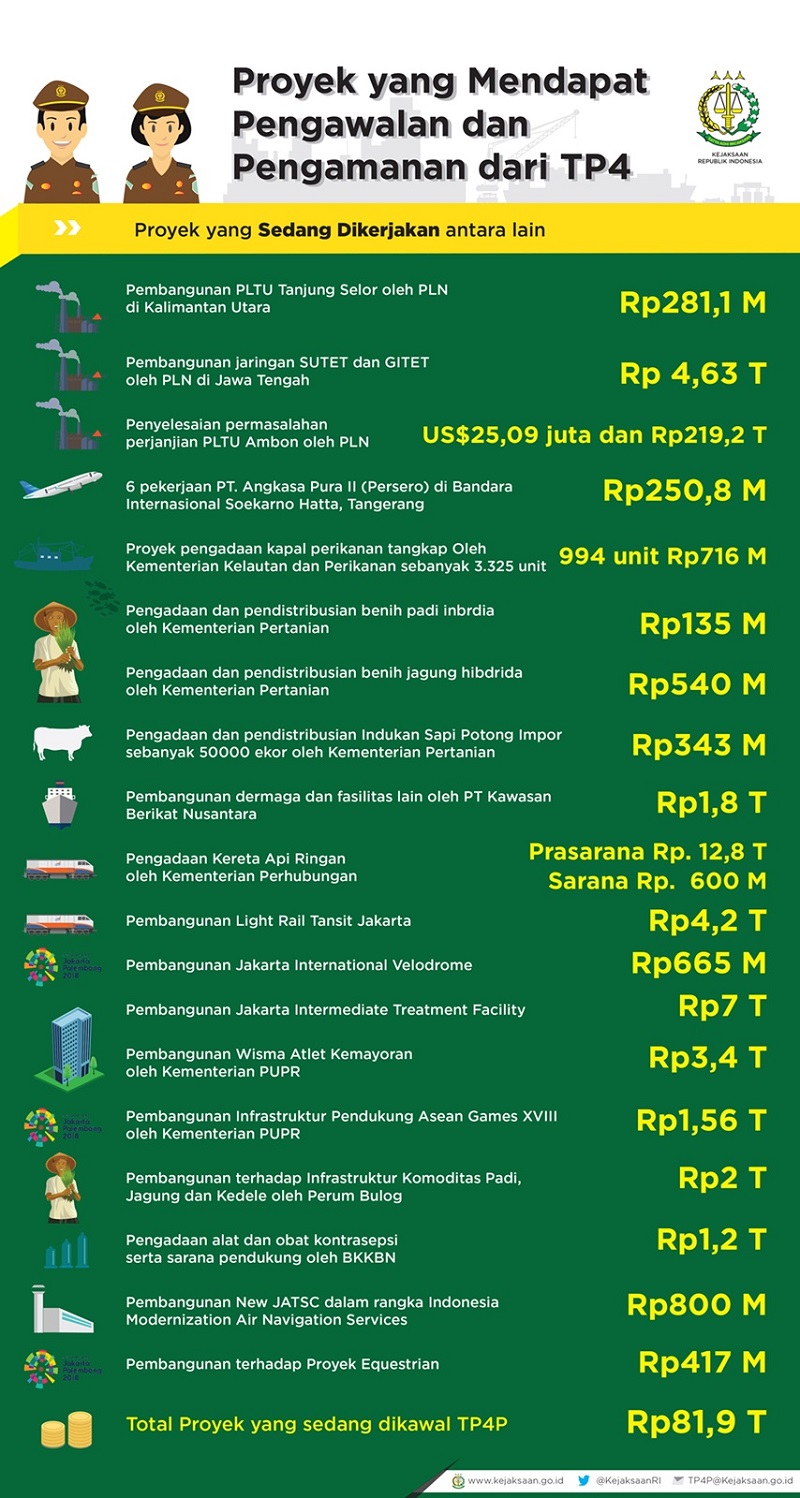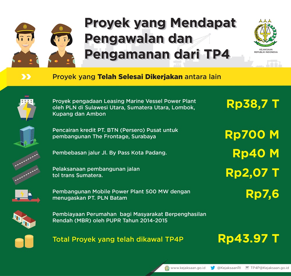 Di usianya yang masih belia, Tim Pengawal dan Pengaman Pemerintah dan Pembangunan (TP4) Kejaksaan RI telah memegang peranan penting dalam pembangunan nasional. Di tahun 2017 ini, total nilai proyek yang dikawal dan diamankan tim yang diperkuat oleh Bidang Intelijen; Bidang Perdata dan Tata Usaha Negara serta Bidang Pidana Khusus Kejaksaan ini mencapai Rp81,9 Triliun.