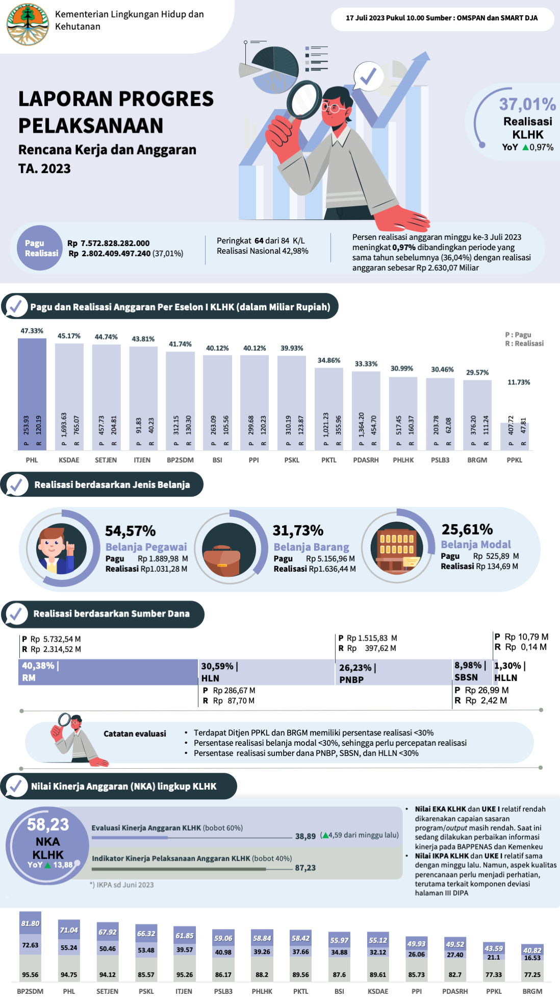Pagu Anggaran KLHK sebesar Rp. 7,57 Triliun dengan progres realisasi hingga minggu ini (17 Juli 2023) sebesar 37,01% atau sebesar Rp. 2,80 Triliun. Apabila dibandingkan dengan ca...