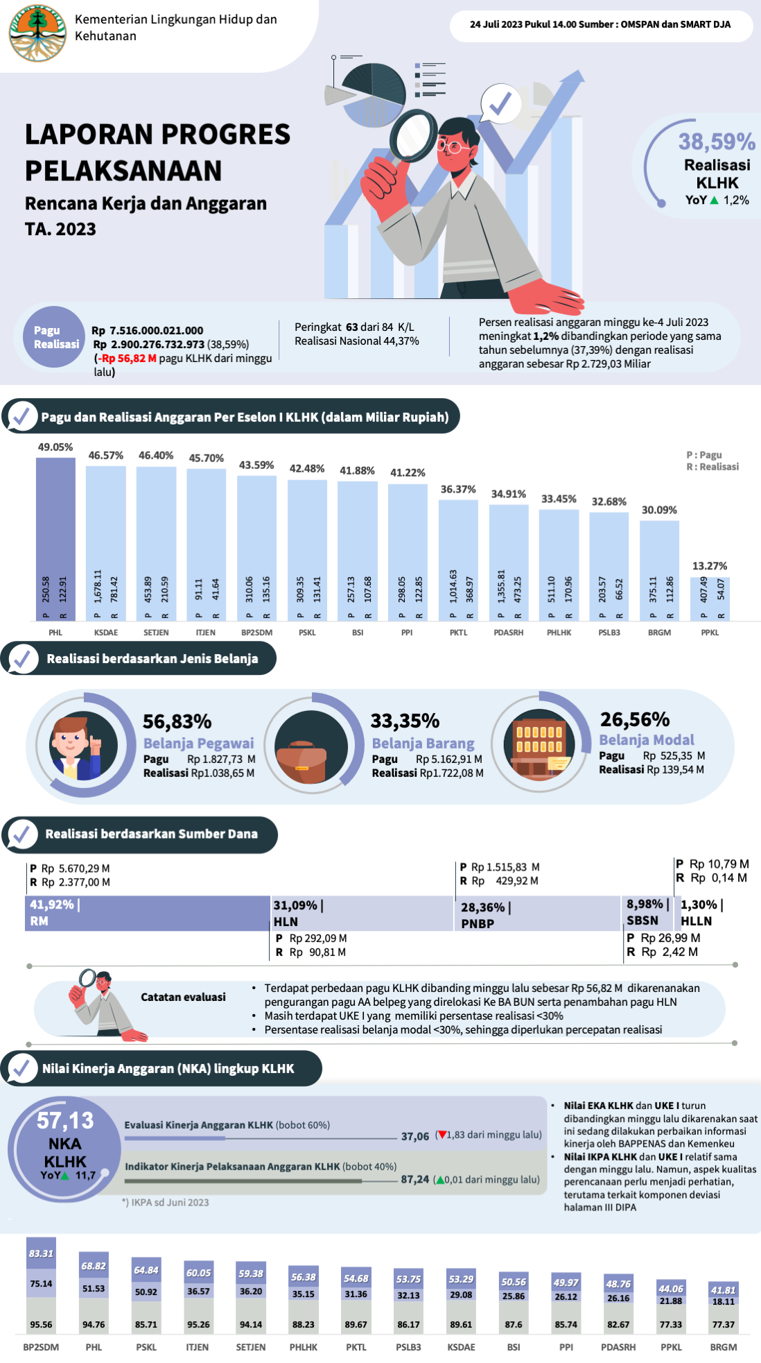 Pagu Anggaran KLHK sebesar Rp. 7,51 Triliun dengan progres realisasi hingga minggu ini (24 Juli 2023) sebesar 38,59% atau sebesar Rp. 2,90 Triliun. Apabila dibandingkan dengan ca...