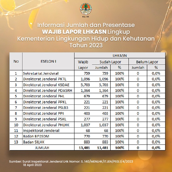 Informasi Jumlah dan Presentase WAJIB LAPOR LHKASN Lingkup Kementerian Lingkungan Hidup dan Kehutanan Tahun 2023...
