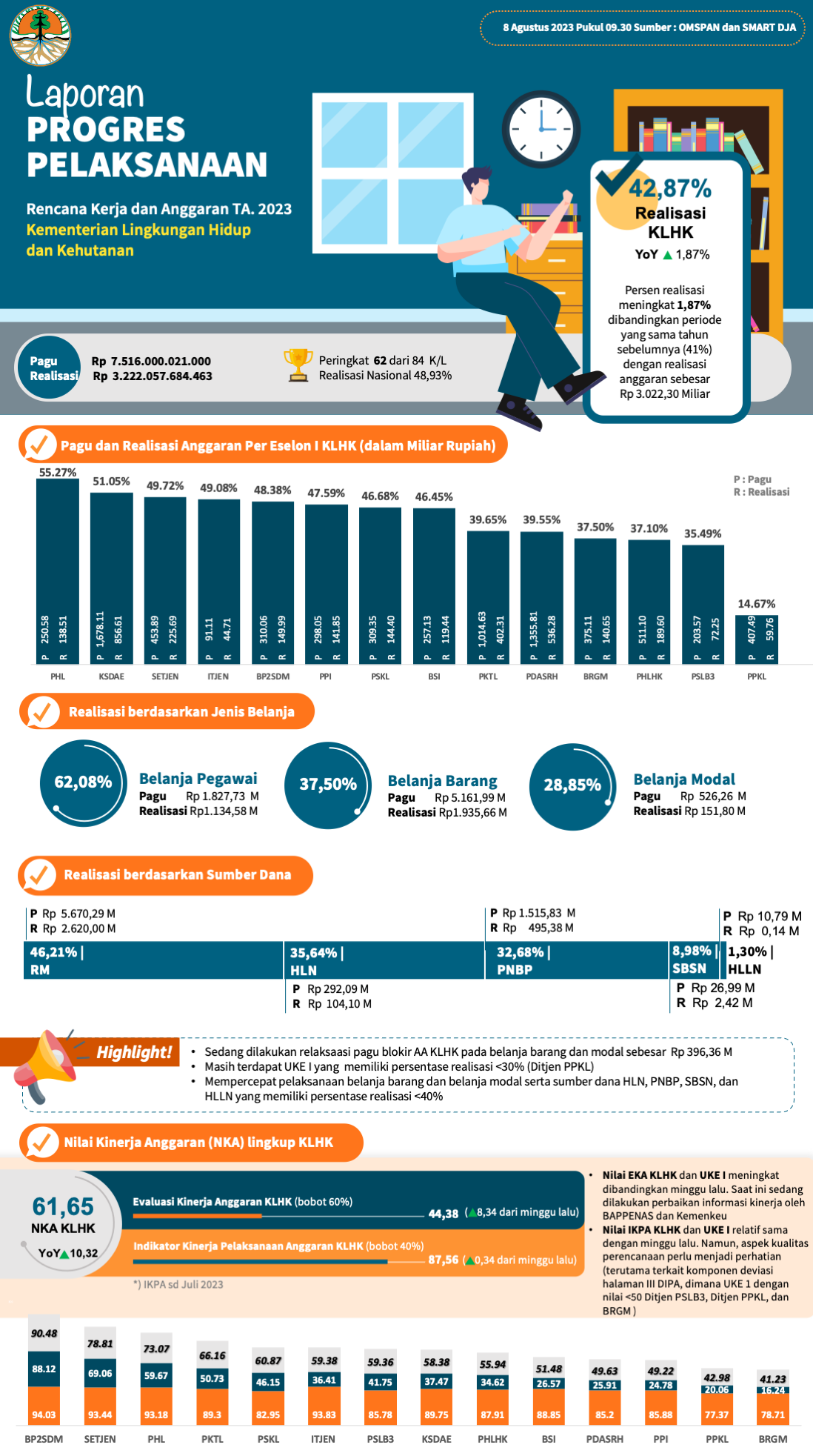 Pagu Anggaran KLHK sebesar Rp. 7,51 Triliun dengan progres realisasi hingga minggu ini (8 Agustus 2023) sebesar 42,87% atau sebesar Rp. 3,22 Triliun. Apabila dibandingkan dengan ...