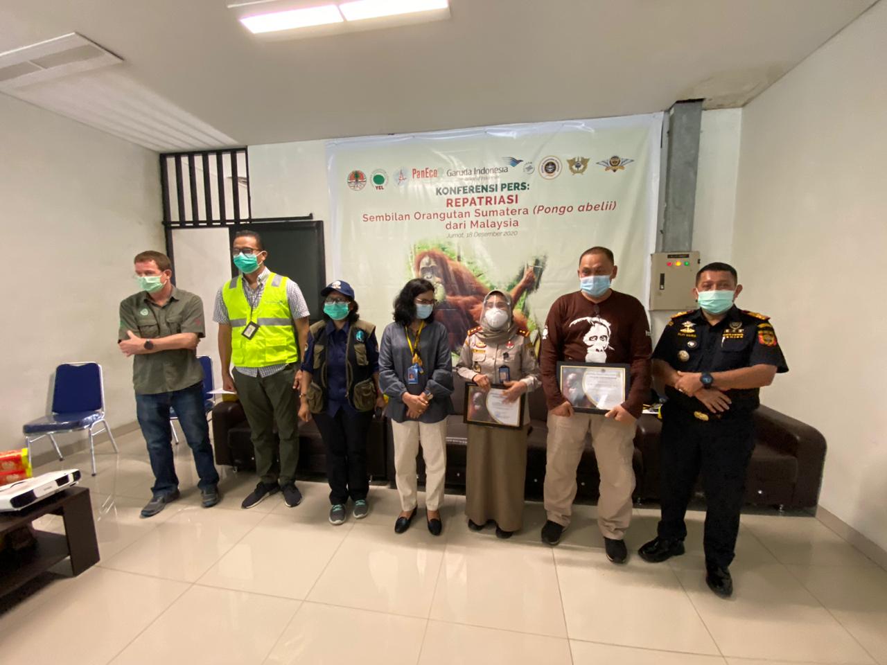 Kementerian Lingkungan Hidup dan Kehutanan (KLHK) beserta Kementerian Luar Negeri, Kedutaan Besar RI Kuala lumpur dan Kedutaan Besar RI Bangkok telah berhasil memulangkan 11 (sebelas) individu orangutan sumatera (Pongo abelii) yang terdiri dari 9 (sembilan) orangutan dari Malaysia dan 2 (dua) orangutan dari Thailand. Kesebelas orangutan tersebut pada hari Jumat, 18 Desember 2020, telah sampai di Sumatera Utara dan Jambi untuk melakukan karantina sebelum nantinya kembali ke habitatnya. Sembilan orangutan dari Malaysia diterbangkan ke Sumatera Utara sedangkan dua orangutan dari Thailand diterbangkan ke Jambi.