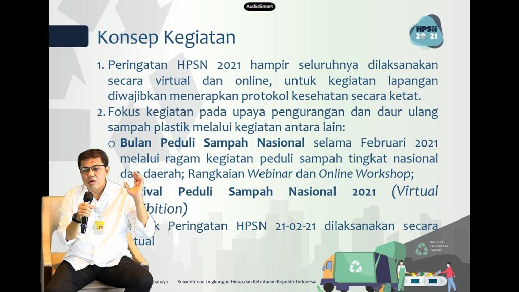Pada kesempatan tersebut, Direktur Pengelolaan Sampah KLHK, Novrizal, menyampaikan Peringatan HPSN 2021 mengambil tema “Sampah Bahan Baku Ekonomi di Masa Pandemi”. Adapun penyelenggaraan puncak peringatan HPSN 2021 rencananya dilaksanakan secara hybrid pada 22 Februari mendatang.
