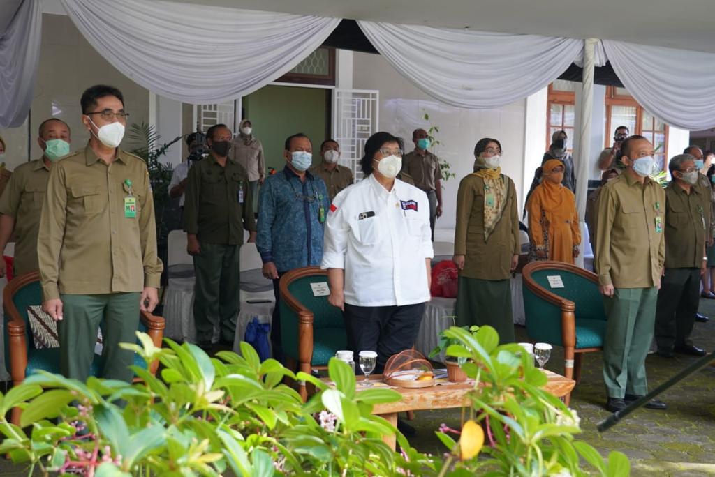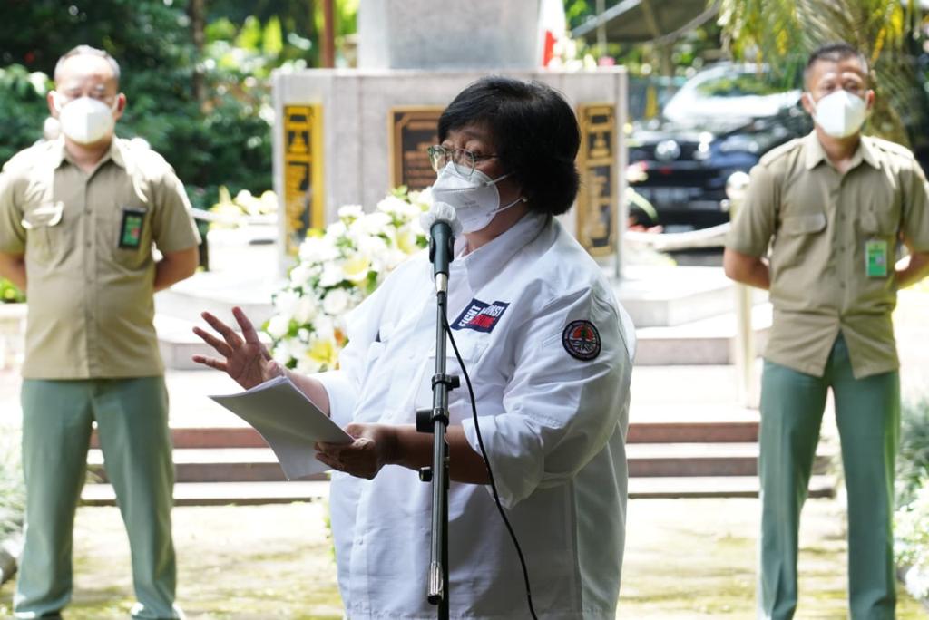 Menteri Lingkungan Hidup dan Kehutanan (LHK), Siti Nurbaya memimpin renungan suci di Tugu Pahlawan Rimbawan Kampus Gunung Batu, Bogor (15/3/2021). Renungan Suci bersama para pejabat Pimpinan Tinggi lingkup Kementerian LHK ini, dilakukan dalam rangkaian peringatan Hari Bakti Rimbawan ke-38 tahun 2021.