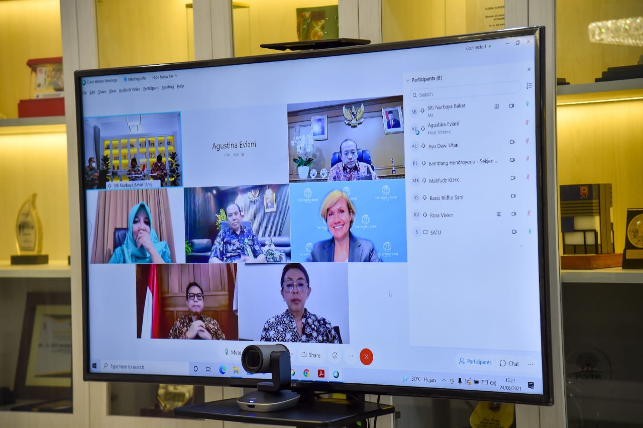 Menteri Lingkungan Hidup dan Kehutanan (LHK) Siti Nurbaya melakukan pertemuan virtual dengan Victoria Kwakwa, World Bank Vice President for East Asia and Pacific dan One Kahkonen, Country Director for Indonesia and Timor Leste pada Kamis (24/06). Pertemuan membahas tiga agenda pokok terkait carbon, program mangrove dan dukungan untuk implementasi pelaksanaan Undang-Undang No.11 Tahun 2021 Tentang Cipta Kerja (UUCK) bidang Lingkungan Hidup dan Kehutanan, kelengkapan operasional, supervisi standard lingkungan, pengawasan dan law enforcement.