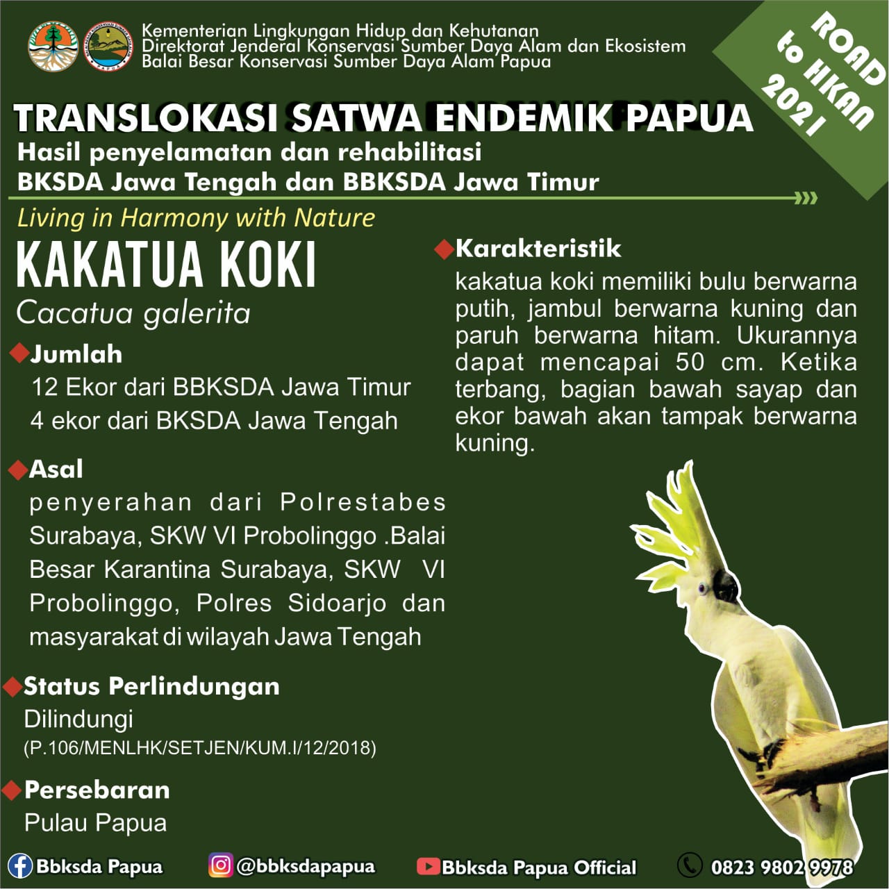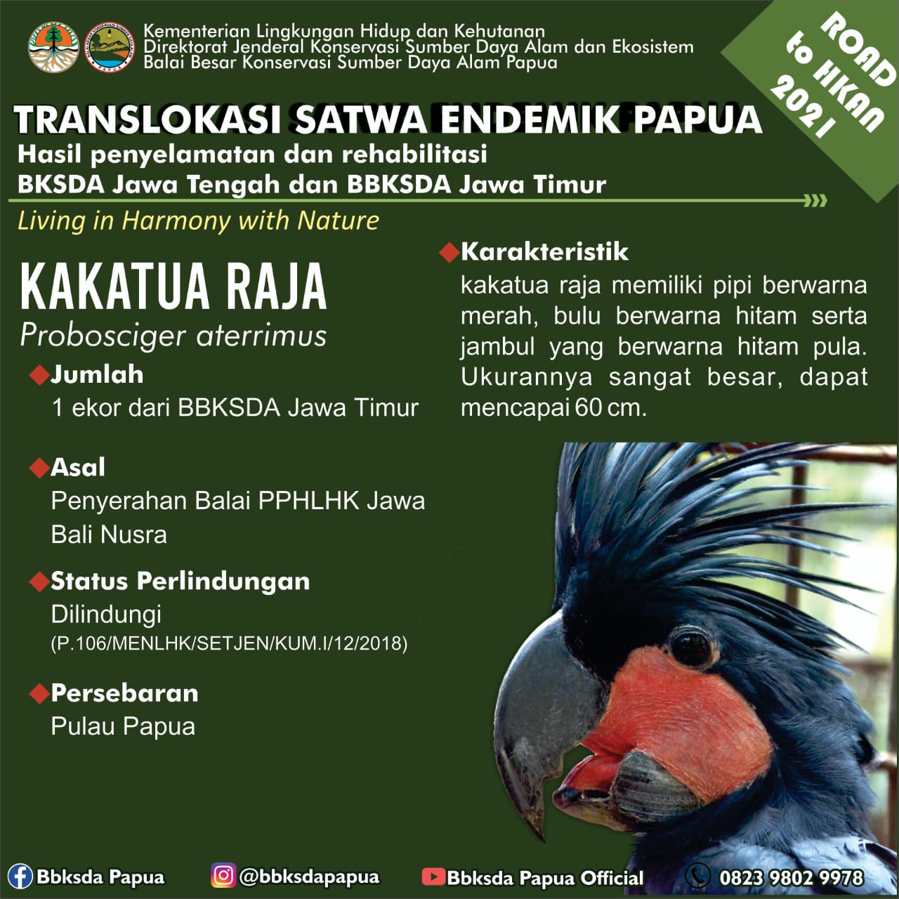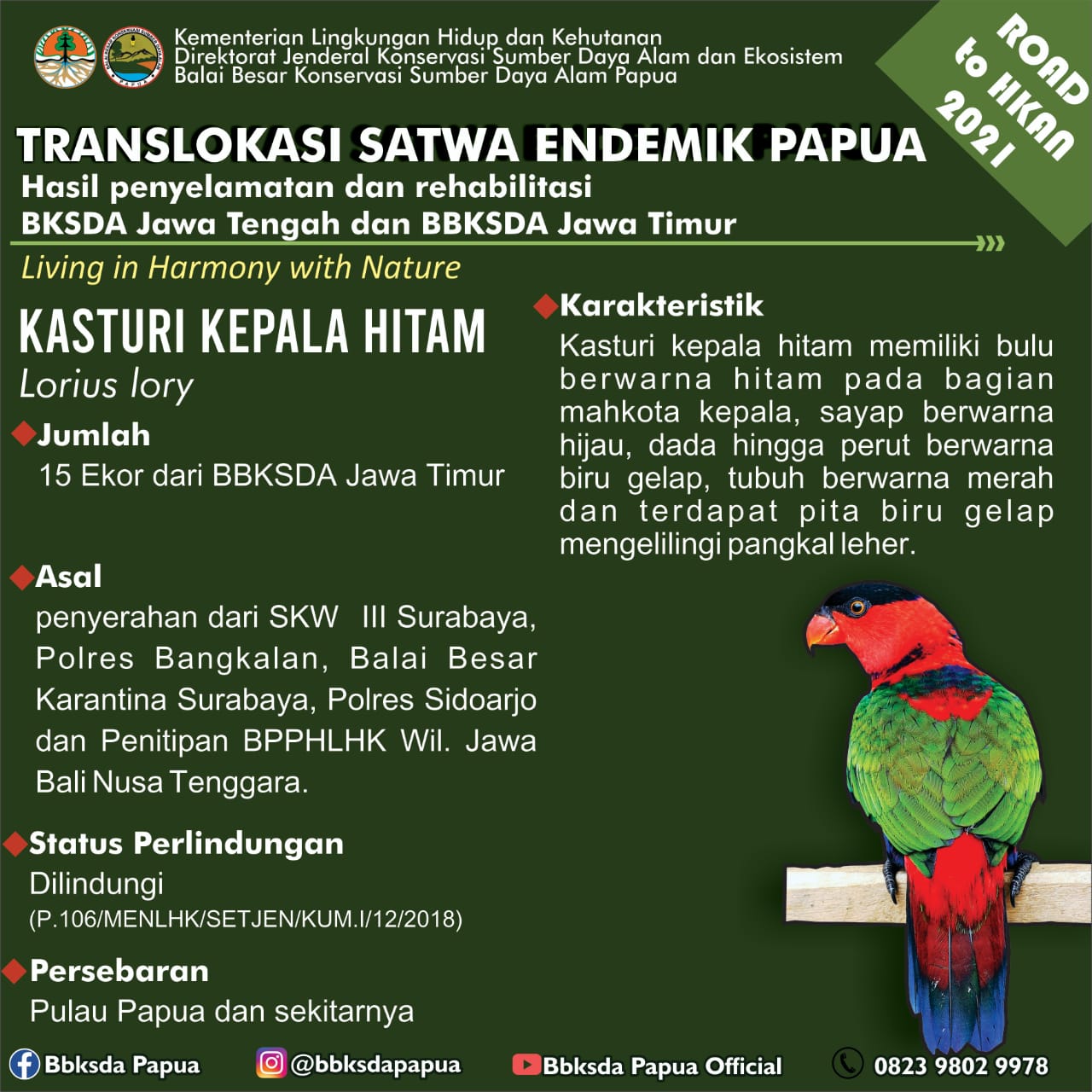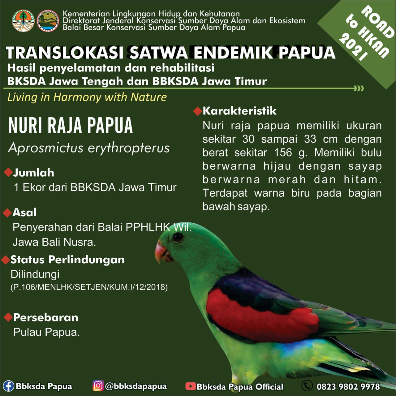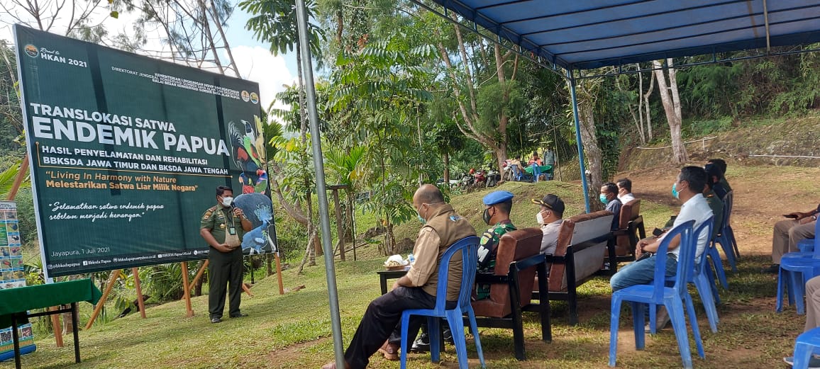 Dalam rangka memperingati Hari Lingkungan Hidup Sedunia dan Road to Hari Konservasi Alam Nasional 2021, Balai Besar Konservasi Sumber Daya Alam (BBKSDA) Papua menerima translokasi satwa sejumlah 46 ekor burung dari 10 jenis aves (1/7). Satwa tersebut berasal dari Balai KSDA Jawa Tengah dan Balai Besar KSDA Jawa Timur.
