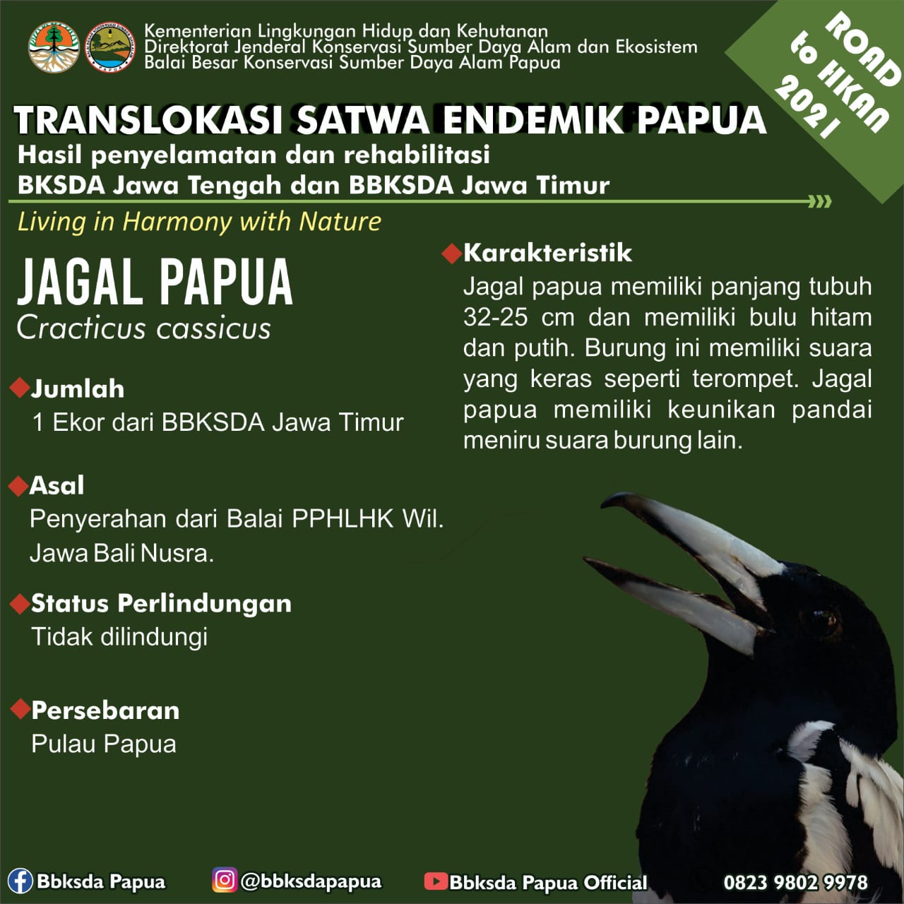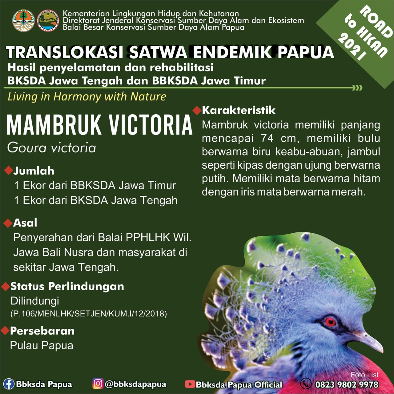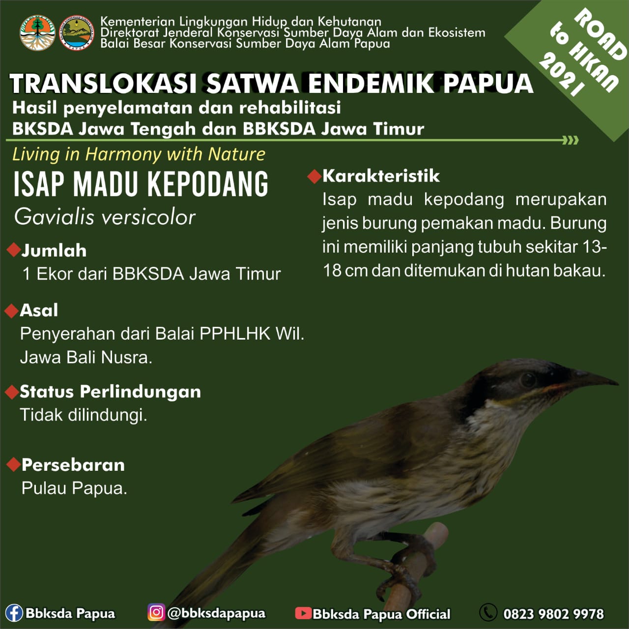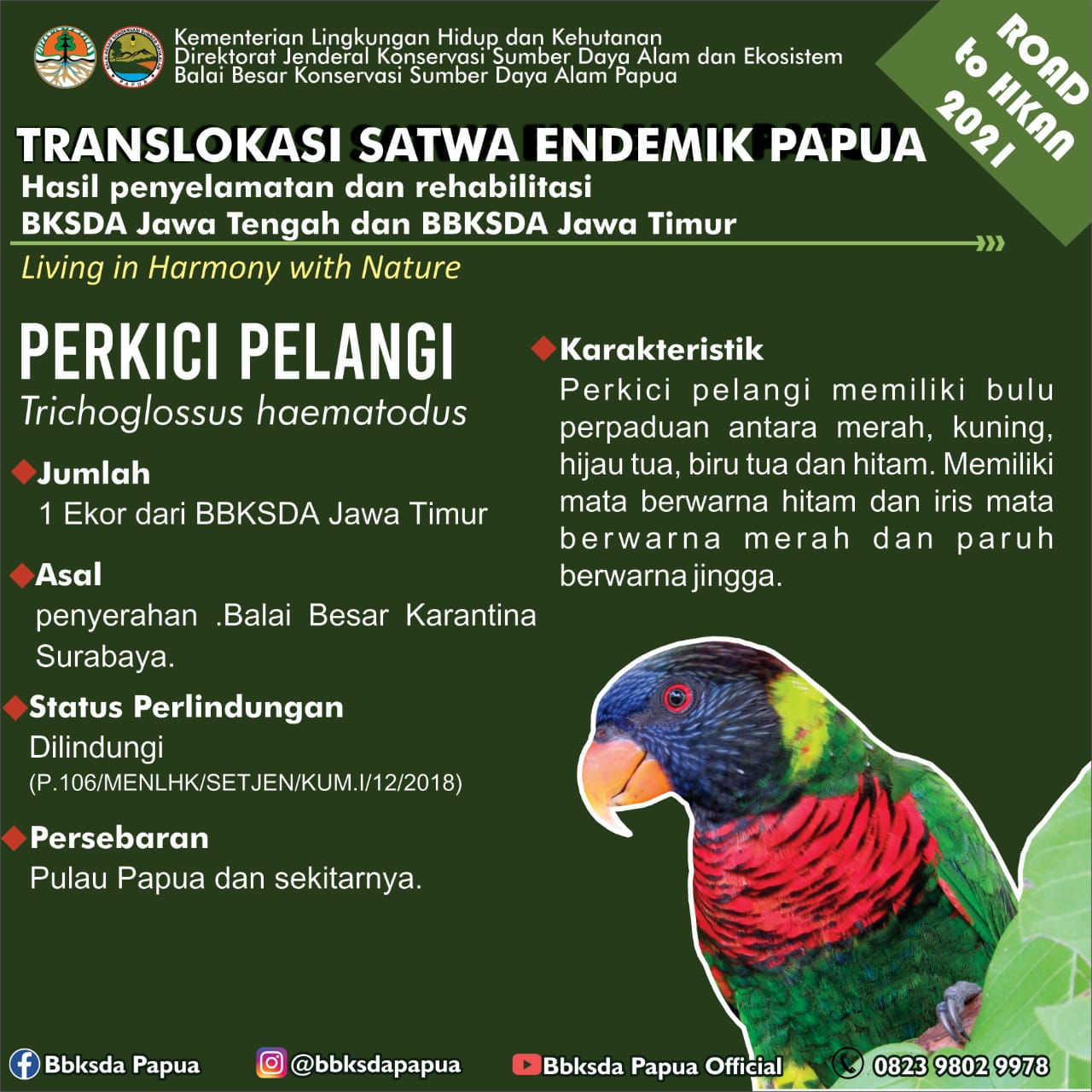 Dalam rangka memperingati Hari Lingkungan Hidup Sedunia dan Road to Hari Konservasi Alam Nasional 2021, Balai Besar Konservasi Sumber Daya Alam (BBKSDA) Papua menerima translokasi satwa sejumlah 46 ekor burung dari 10 jenis aves (1/7). Satwa tersebut berasal dari Balai KSDA Jawa Tengah dan Balai Besar KSDA Jawa Timur.