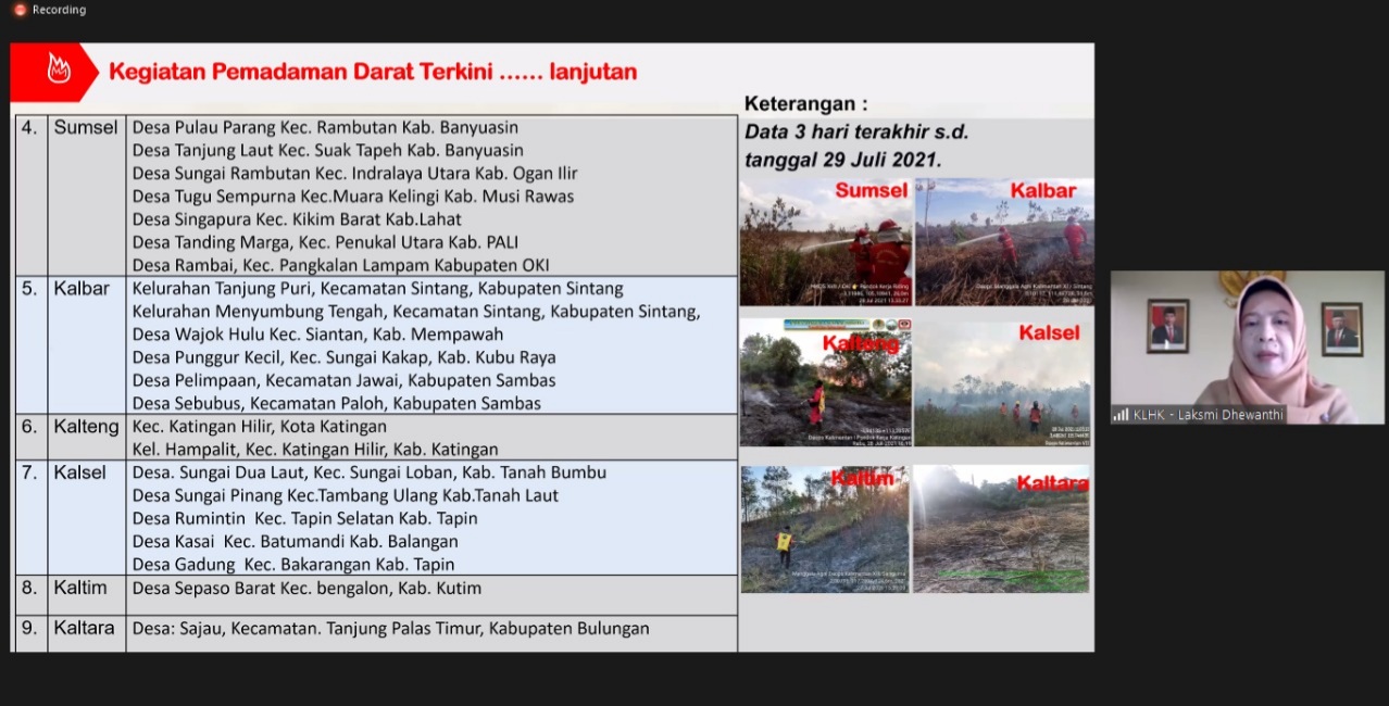 Laksmi kemudian menyampaikan upaya pengendalian karhutla di tingkat tapak telah dilaksanakan bersama-sama dengan kolaborasi berbagai pihak yang tergabung dalam patroli terbadu. Hasil rekapitulasi kegiatan pemadaman darat menunjukkan bahwa sebanyak total 1.320 kegiatan telah dilakukan di seluruh wilayah di Indonesia. Provinsi Kalimantan Barat dan Riau menjadi wilayah terbanyak dilakukan pemdaman dengan total masing-masing 361 dan 282 kegiatan.