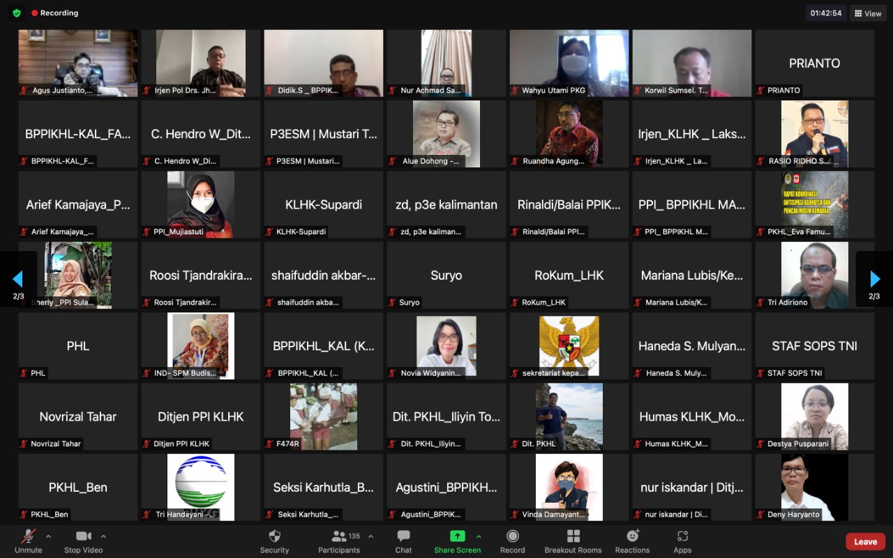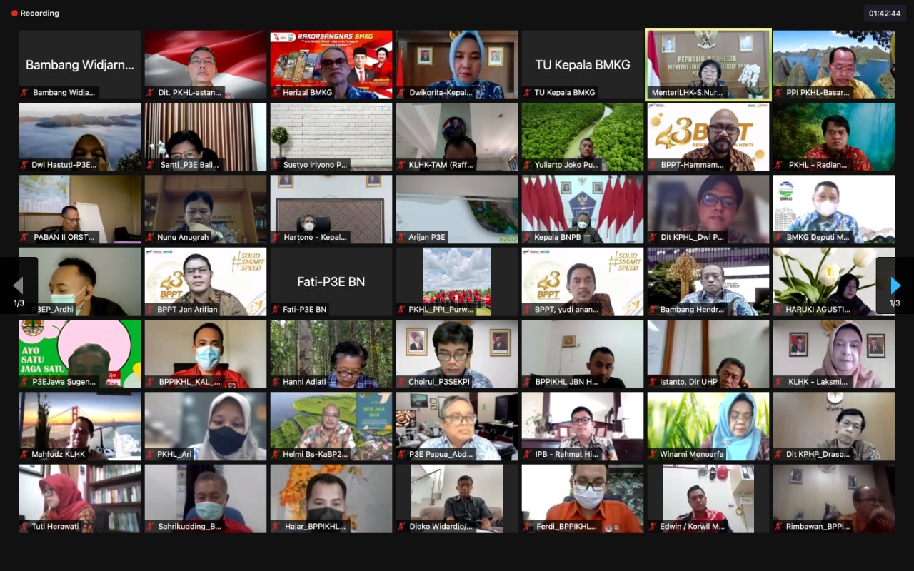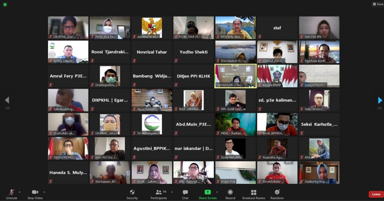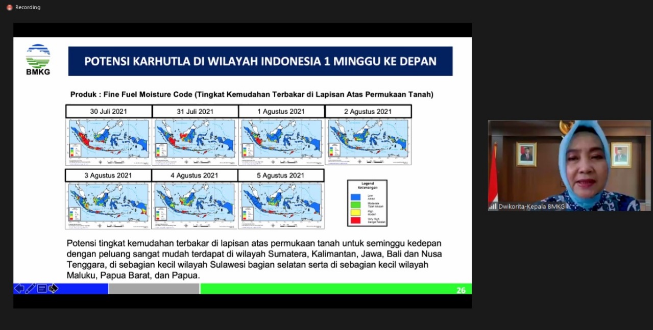 Menteri Lingkungan Hidup dan Kehutanan (LHK), Siti Nurbaya secara virtual (30/072021), memimpin langsung rapat teknis membahas penjelasan prakiraan cuaca dan teknik modifikasi cuaca serta kesiapan patroli desa. Dalam rapat ini, Menteri LHK mengundang seluruh pihak terkait seperti BMKG, BNPB, TNI, POLRI, BPPT, serta ahli klimatologi dari IPB University.