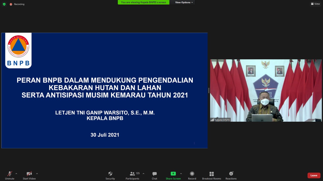 Kepala BNPB, Letnan Jenderal Ganip Warsito menegaskan bahwa selain fokus dalam upaya pengendalian COVID-19, pihaknya akan terus memberikan dukungan pendampingan dalam bentuk bantuan dana siap pakai serta sarana dan prasarana operasi pemadaman darat dan udara. Kemudian, pihaknya juga berkomitmen dalam hal pengerahan sumber daya nasional pada saat keadaan darurat bencana. BNPB juga membangun keterpaduan dalam peningkatan sosial ekonomi masyarakat di daerah rawan kebakaran hutan dan lahan dan mendukung KLHK dalam harmonisasi peraturan perundangan untuk pengendalian kebakaran hutan dan lahan
