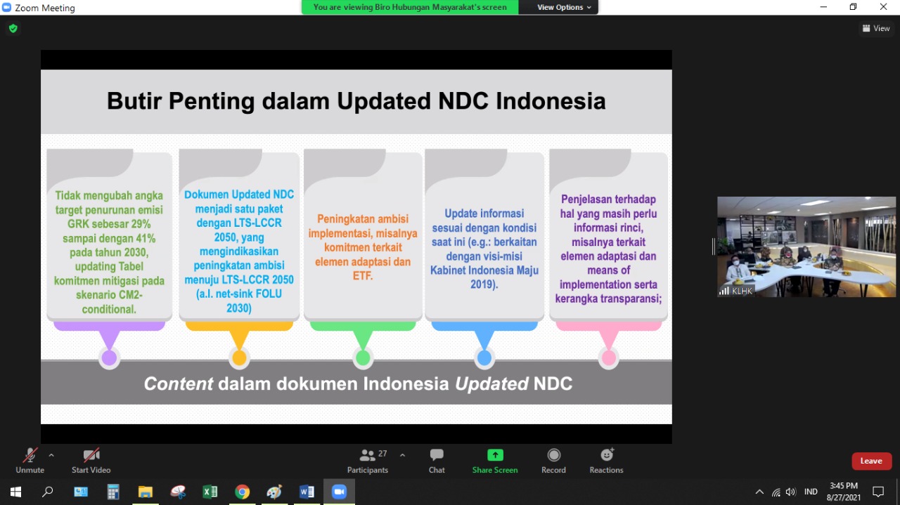 Direktur Jenderal Pengendalian Perubahan Iklim (PPI), KLHK, Laksmi Dhewanthi pada kesempatan ini juga menyampaikan bahwa KLHK juga telah mengembangkan berbagai macam modalitas atau support system untuk memastikan apa yang direncanakan di NDC bisa tercapai. Support system tersebut diantaranya adalah strategi dan peta jalan mitigasi dan adaptasi perubahan iklim, Sistem Inventori Gas Rumah Kaca (GRK), Sistem Registri Nasional (SRN), Sistem Informasi Data Indeks Kerentanan (SIDIK), Program Kampung iklim (Proklim) dan lainnya. Support system ini terus berkembang dan bergerak sesuai dengan kebutuhan karena tantangan dan strategi ke depan memerlukan dukungan.