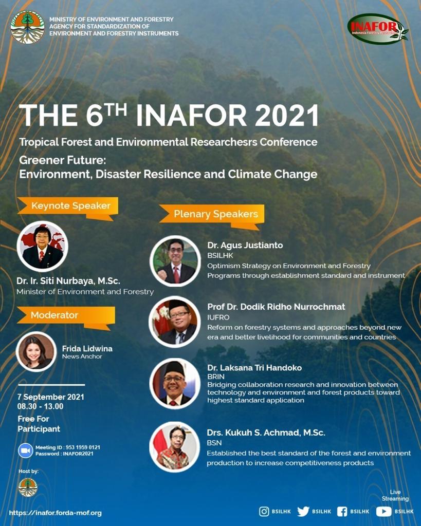 Untuk mempromosikan hasil kerjanya, BSILHK dan para mitra strategis menyelenggarakan Konferensi Internasional ke-6 para Peneliti Kehutanan dan Lingkungan Indonesia (Indonesia Forestry Researchers-INAFOR) 2021 atau The 6th INAFOR 2021 pada 7-8 September 2021.