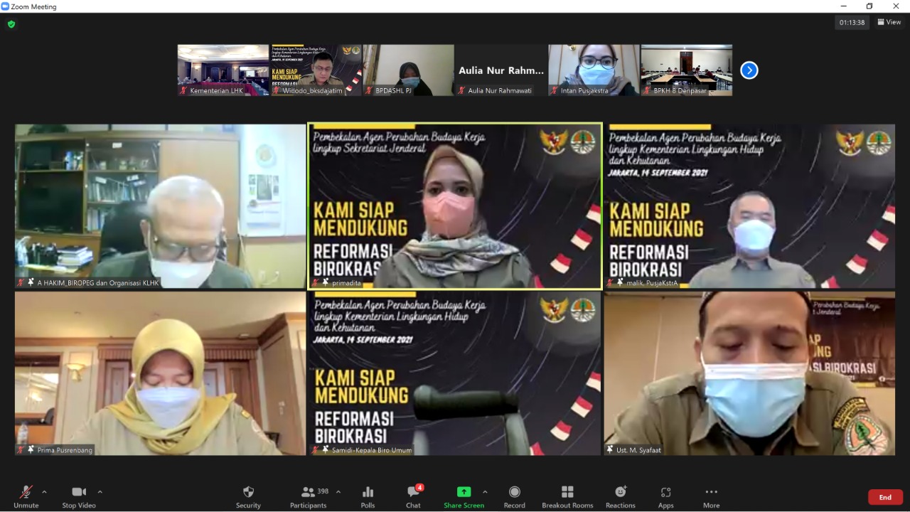 Dalam rangka mendukung Pelaksanaan reformasi birokrasi, Kementerian Lingkungan Hidup dan Kehutanan (KLHK) melalui Pusat Kajian Kebijakan Strategis bekerja sama dengan Pusat Perencanaan Pengembangan SDM selaku Pokja Manajemen Perubahan mengadakan pembekalan Agen Perubahan Budaya Kerja Lingkup KLHK secara virtual pada Selasa (14/9). Kegiatan ini dilaksanakan dengan tujuan untuk memberikan pemahaman yang sama mengenai peran agen perubahan di masing-masing satuan kerja.