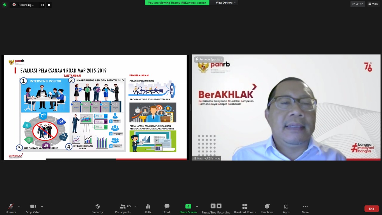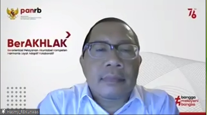 Hadir sebagai pembicara, Asisten Deputi Koordinasi Pelaksanaan Dan Evaluasi Reformasi Birokrasi, Akuntabilitas Aparatur Dan Pengawasan Wilayah III KemenPANRB, Akhmad Hasmy, menyampaikan bahwa Reformasi Birokrasi merupakan salah satu dari 5 prioritas kerja dari Presiden Jokowi dalam periode 2020-2024. Reformasi Birokrasi tersebut berupaya membentuk birokrasi yang bersih dan akuntabel, kapabel dan memberikan pelayanan publik yang prima.