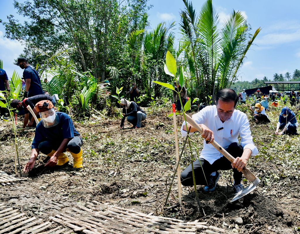 "Rehabilitasi mangrove dilakukan untuk memulihkan, melestarikan kawasan hutan mangrove. Selain itu, rehabilitasi mangrove juga untuk mengantisipasi dan memitigasi dampak perubahan iklim," kata Presiden Jokowi saat memberikan keterangan pers.