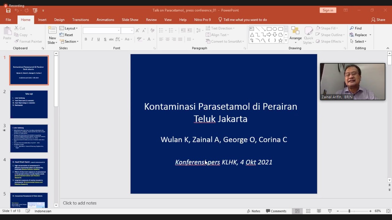 Salah seorang peneliti pada penelitian “Tingginya konsentrasi paracetamol pada buangan air limbah mendominasi air di Teluk Jakarta, Indonesia”, yaitu Prof. Zainal Arifin menjelaskan riset paracetamol dan bahan pencemar ini dilakukan sejak 2017 sampai 2020. Dari lima lokasi penelitian yaitu Angke, Ancol, Tanjung Priuk, Cilincing dan Pantai Eretan, paracetamol terdeteksi di dua lokasi yaitu Ancol dan Angke.