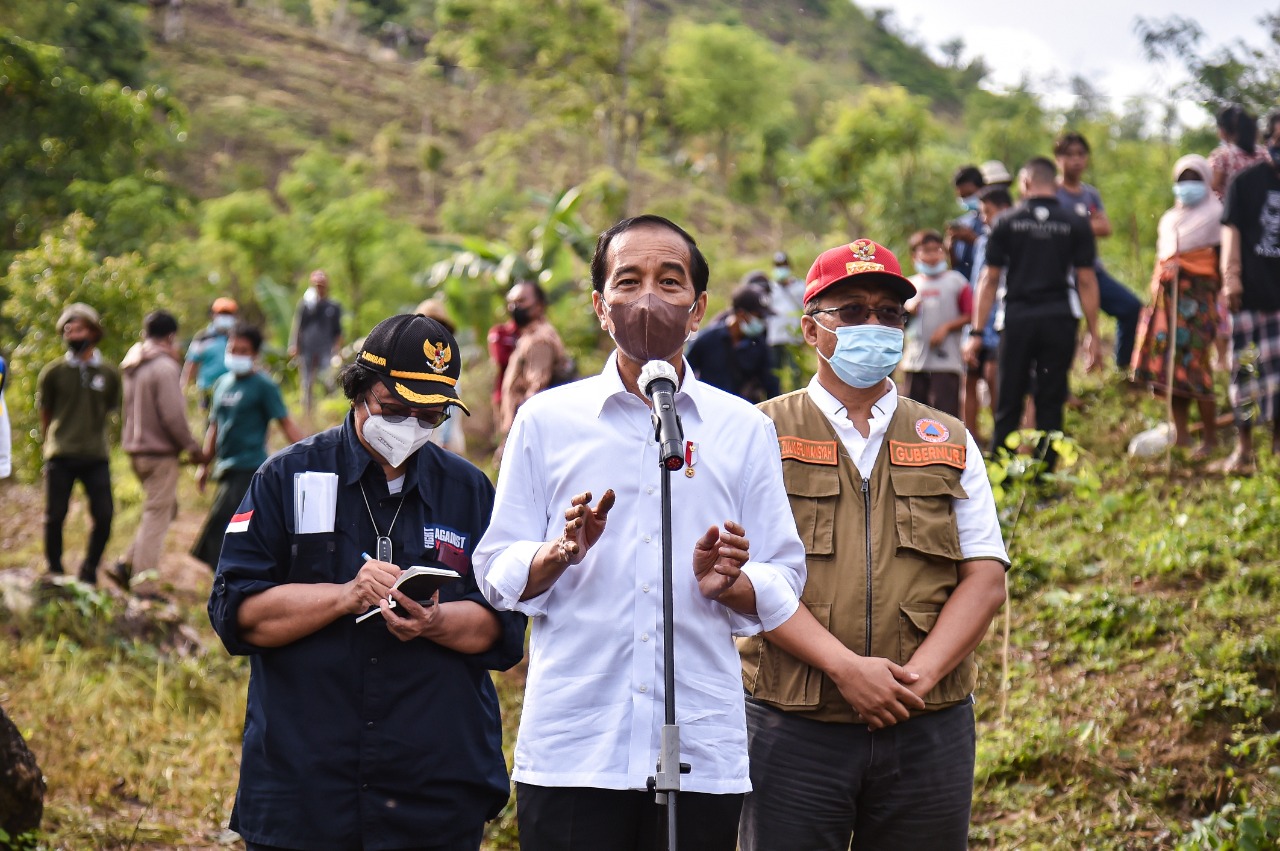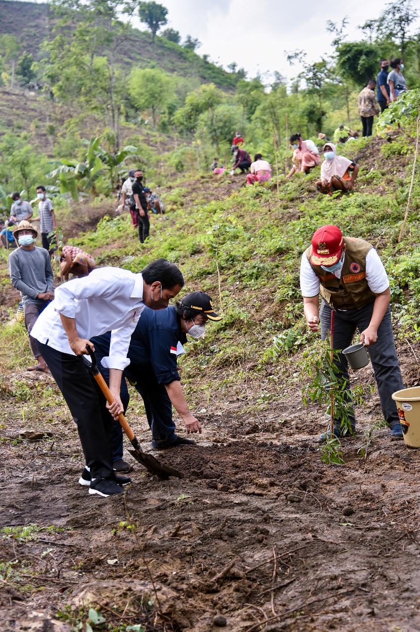 Presiden Joko Widodo bersama masyarakat melakukan penanaman pohon di kawasan Hutan Gunung Pepe, di Desa Rembitan, Kec. Pujut, Kab. Lombok Tengah, Provinsi Nusa Tenggara Barat, pada Sabtu (13/11/2021).
