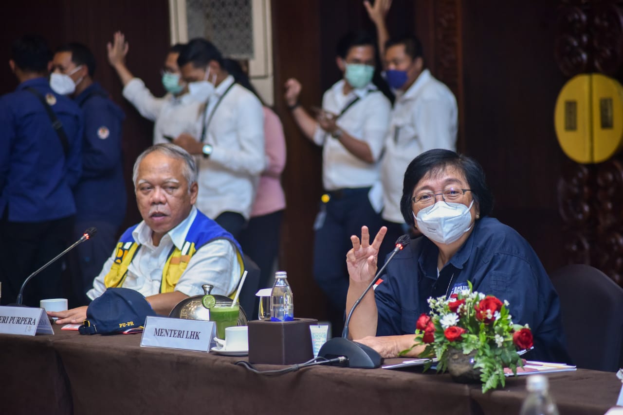 Bersama-sama: Menteri Lingkungan Hidup dan Kehutanan (LHK), Siti Nurbaya; Menteri Pekerjaan Umum dan Perumahan Rakyat, Basuki Harimulyono; dan Gubernur Bali, Wayan Koster beserta jajaran teknis, para pejabat eselon I dan akademisi lakukan pematangan rencana kesiapan showcase Konservasi Mangrove G20 tahun 2022 di Provinsi Bali (13/11/2021).