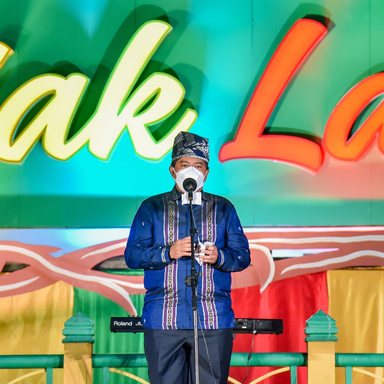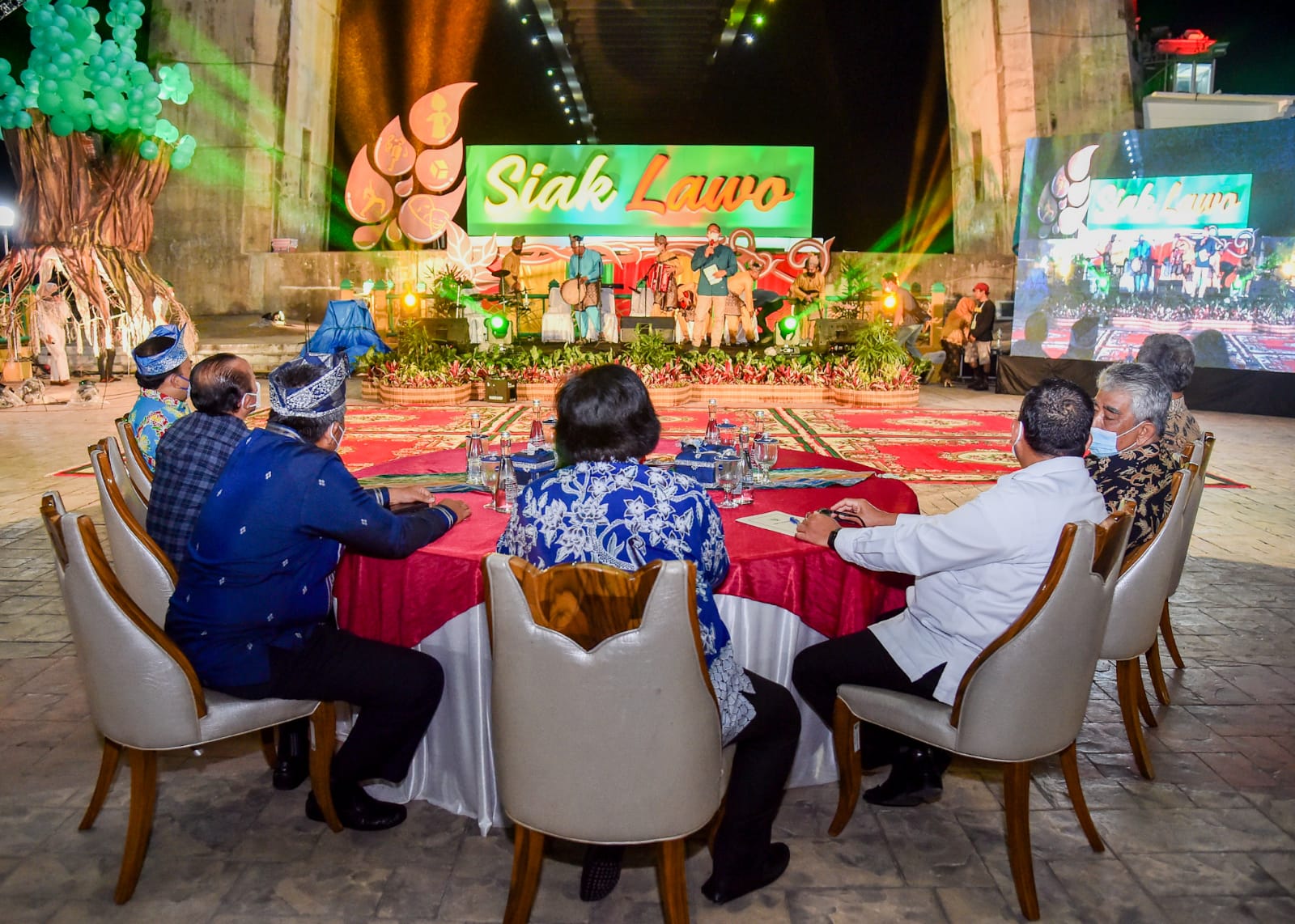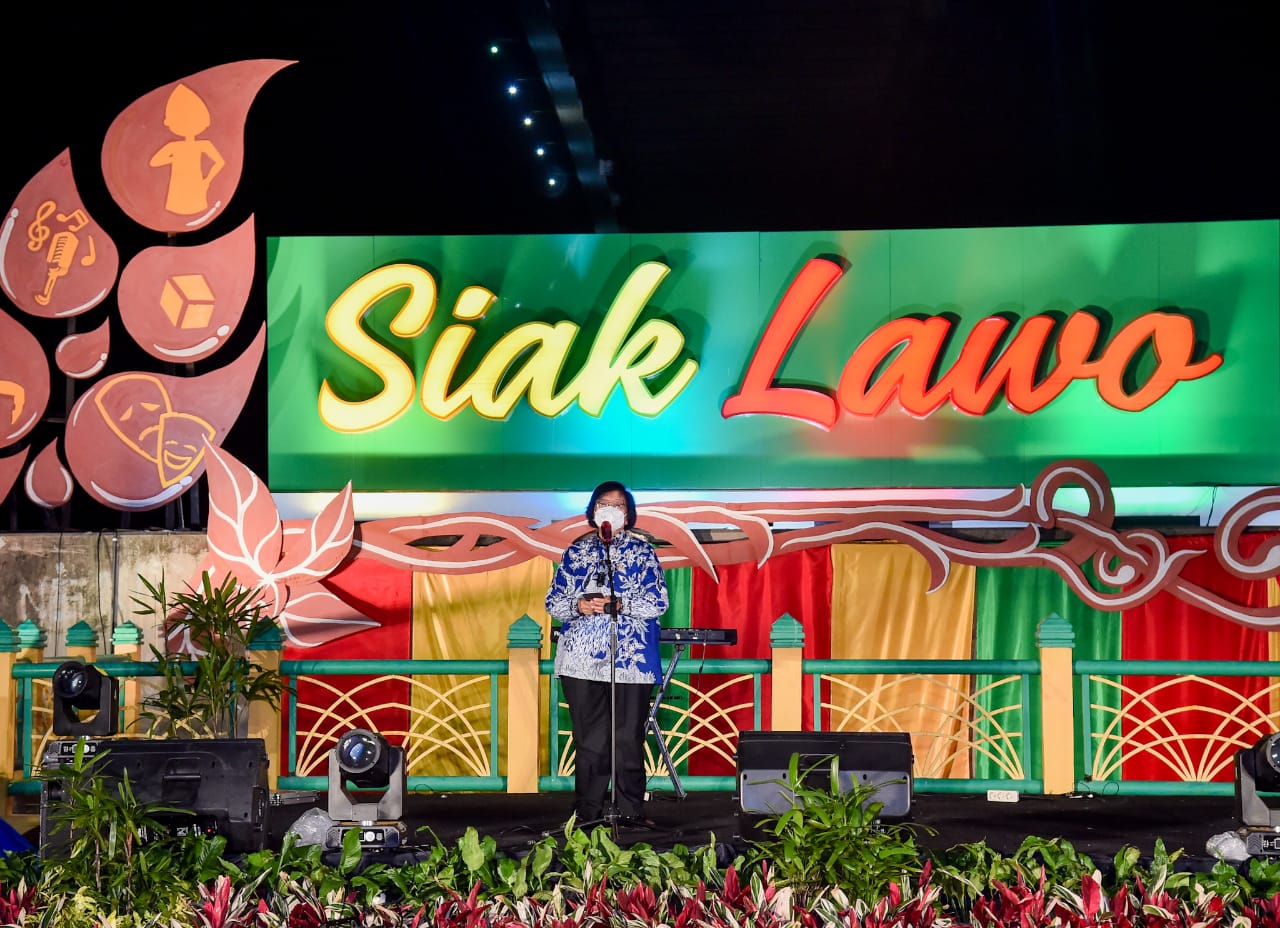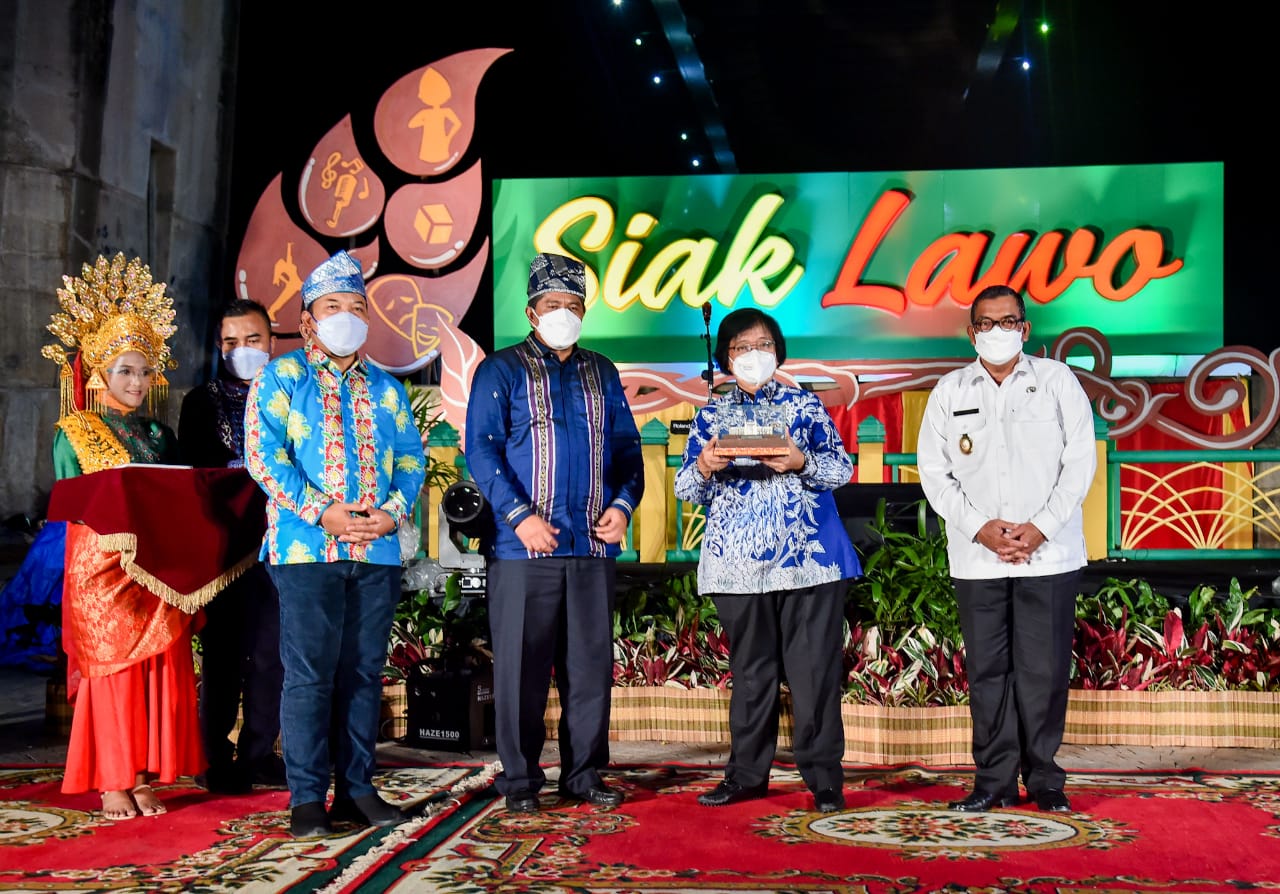 Menteri Lingkungan Hidup dan Kehutanan, Siti Nurbaya Bakar, menghadiri puncak acara Forest Art di Kota Siak, Provinsi Riau, Rabu (22/12/2021) malam. Forest Art merupakan pertunjukan seni bertema lingkungan, yang diinisiasi para seniman, dan NGO Jikalahari, Walhi Riau, Begawai Institute, EOF dan Paradigma.