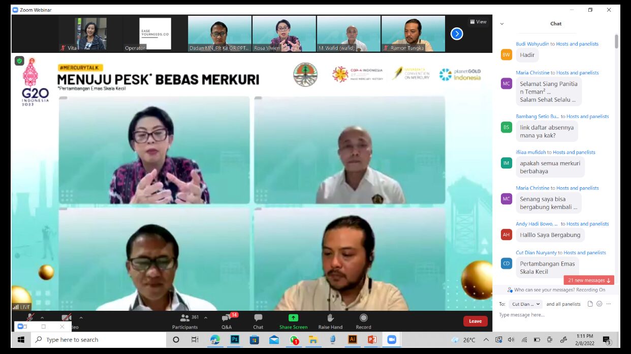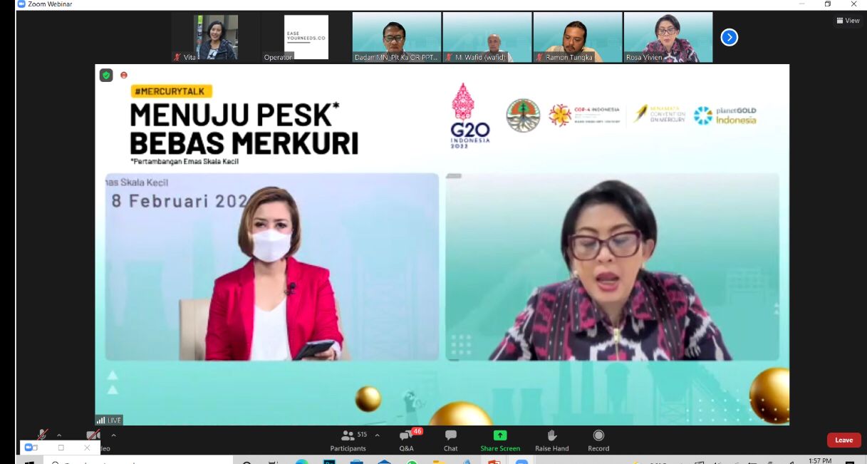 Hal itu disampaikan pada diskusi daring "Menuju PESK Bebas Merkuri," yang digelar oleh KLHK bersama United Nations Development Programme (UNDP), di Jakarta, pada Selasa, (8/2/ 2022). Diskusi digelar sebagai bagian dari tanggung jawab pemerintah Indonesia yang telah ditunjuk sebagai tuan rumah pelaksanaan Pertemuan Keempat Konferensi Para Pihak (Conference of the Parties/COP). Salah satu tujuan konvensi, adalah pengentasan pencemaran lingkungan oleh limbah merkuri.
