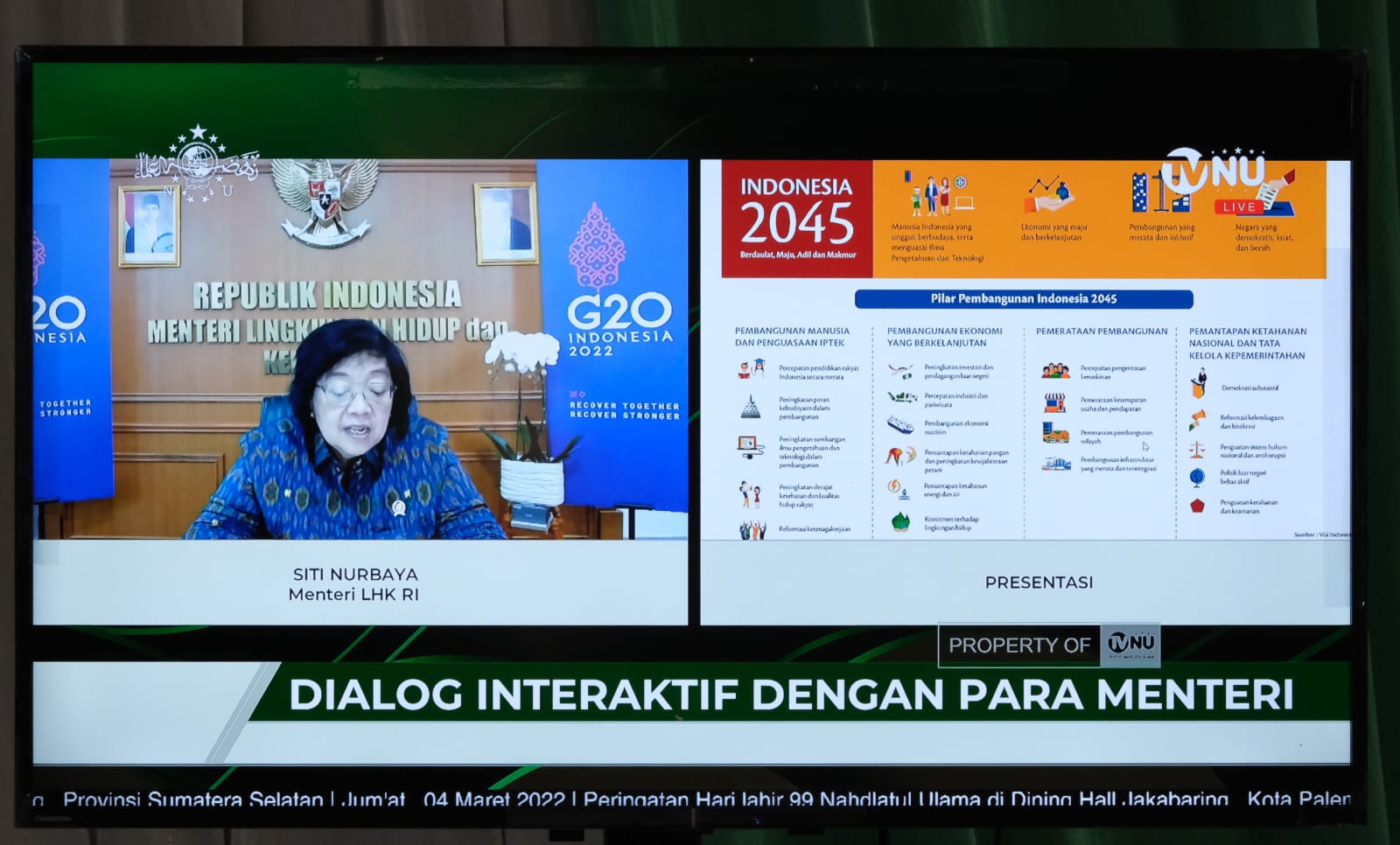 Dalam rangka perayaan hari lahir (harlah) Nahdlatul Ulama (NU) ke-99, Menteri Lingkungan Hidup dan Kehutanan (LHK), Siti Nurbaya hadir secara virtual dalam acara Dialog Interaktif Lingkungan Hidup yang mengusung tema “Pengelolaan Sumber Daya Alam Berkelanjutani, Perlindungan Lingkungan Hidup dan Transisi Energi” pada Sabtu (5/3/2022).