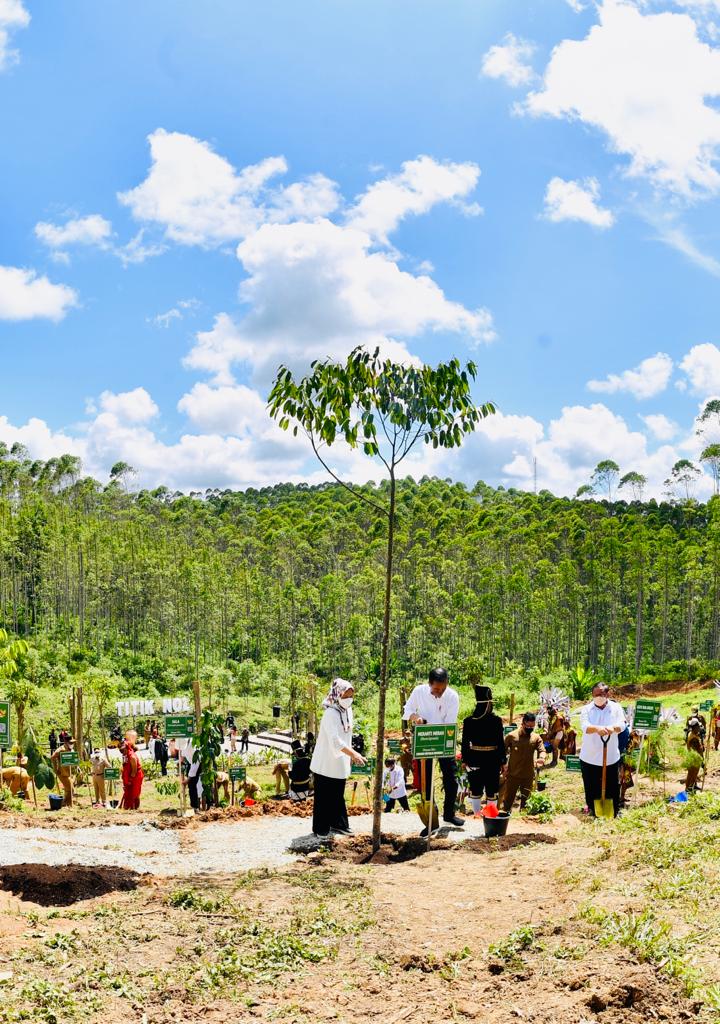 Presiden RI Bapak Joko Widodo bersama Ibu Negara Iriana Joko Widodo, didampingi Menteri Lingkungan Hidup dan Kehutanan Siti Nurbaya menanam berbagai tanaman endemik Indonesia bersama Ketua MPR, para Menteri dan 34 Gubernur se-Indonesia serta 15 Tokoh Masyarakat Kalimantan Timur, di Titik Nol Ibu Kota Nusantara Kalimantan Timur (14/3).