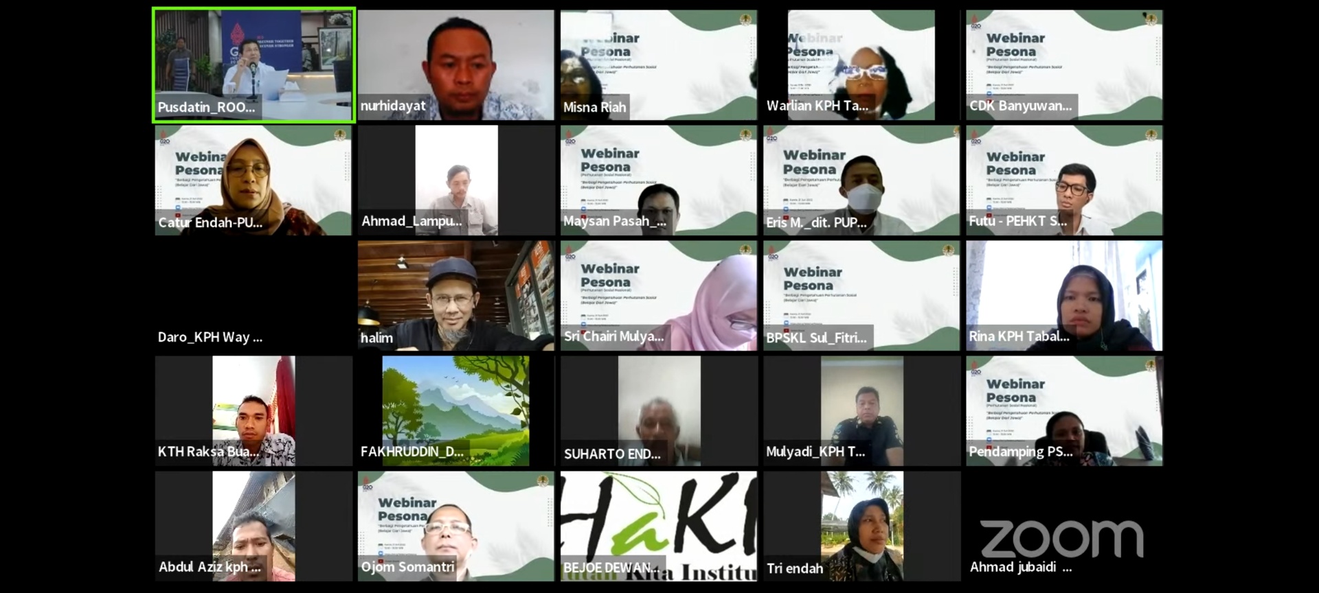 Webinar Pesona dengan tajuk “Berbagi Pengetahuan Perhutanan Sosial (Belajar) dari Jawa” ini menghadirkan narasumber yaitu Direktur Pengembangan Usaha Perhutanan Sosial (PUPS) Catur Endah Prasetiani, Kepala Balai PSKL Wilayah Jawa Bali dan Nusa Tenggara (Jabalnusra) Ojom Somantri, dan Ketua KTH Sumber Makmur Abdi (Sumadi) Gus Nur Hidayat, dengan moderator oleh Anggota Tim Penggerak Perhutanan Sosial, Swary Utami Dewi.