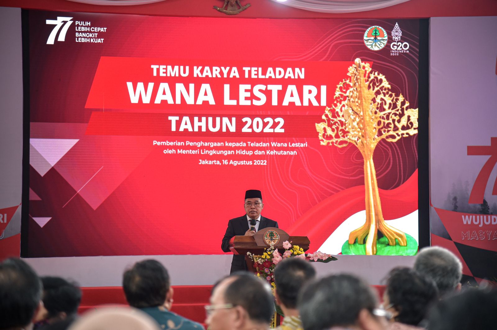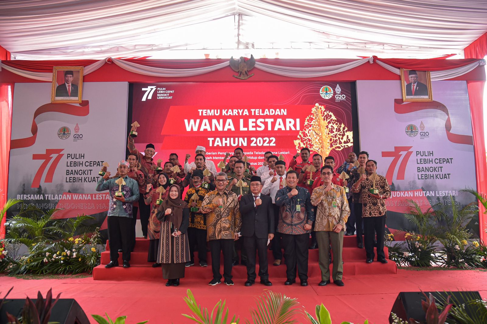 Kementerian Lingkungan Hidup dan Kehutanan memberikan penghargaan kepada para pemenang lomba dan penerima apresiasi Wana Lestari Tingkat Nasional Tahun 2022 pada temu karya yang digelar di Arboretum Ir. Lukito Daryadi, M.Sc Gedung Manggala Wanabakti, Jakarta, Selasa (16/8).