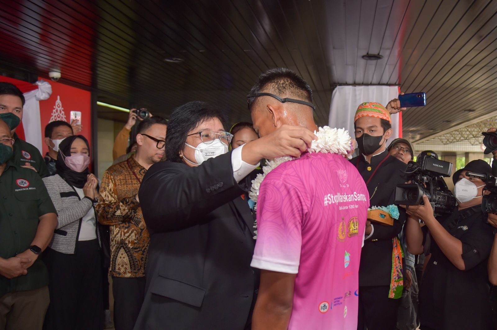 Menteri LHK Siti Nurbaya melakukan penyambutan dan memberi apresiasi kepada Muryansyah, pelaku Solo Triathlon yang telah menempuh jarak Bali – Jakarta sejauh 1.293 km, Selasa, (16/8/2022) di Jakarta. Muryansyah melakukan aksi tersebut guna mengkampanyekan pengelolaan sampah berkelanjutan kepada masyarakat yang tinggal disepanjang jalur yang dilewati.
