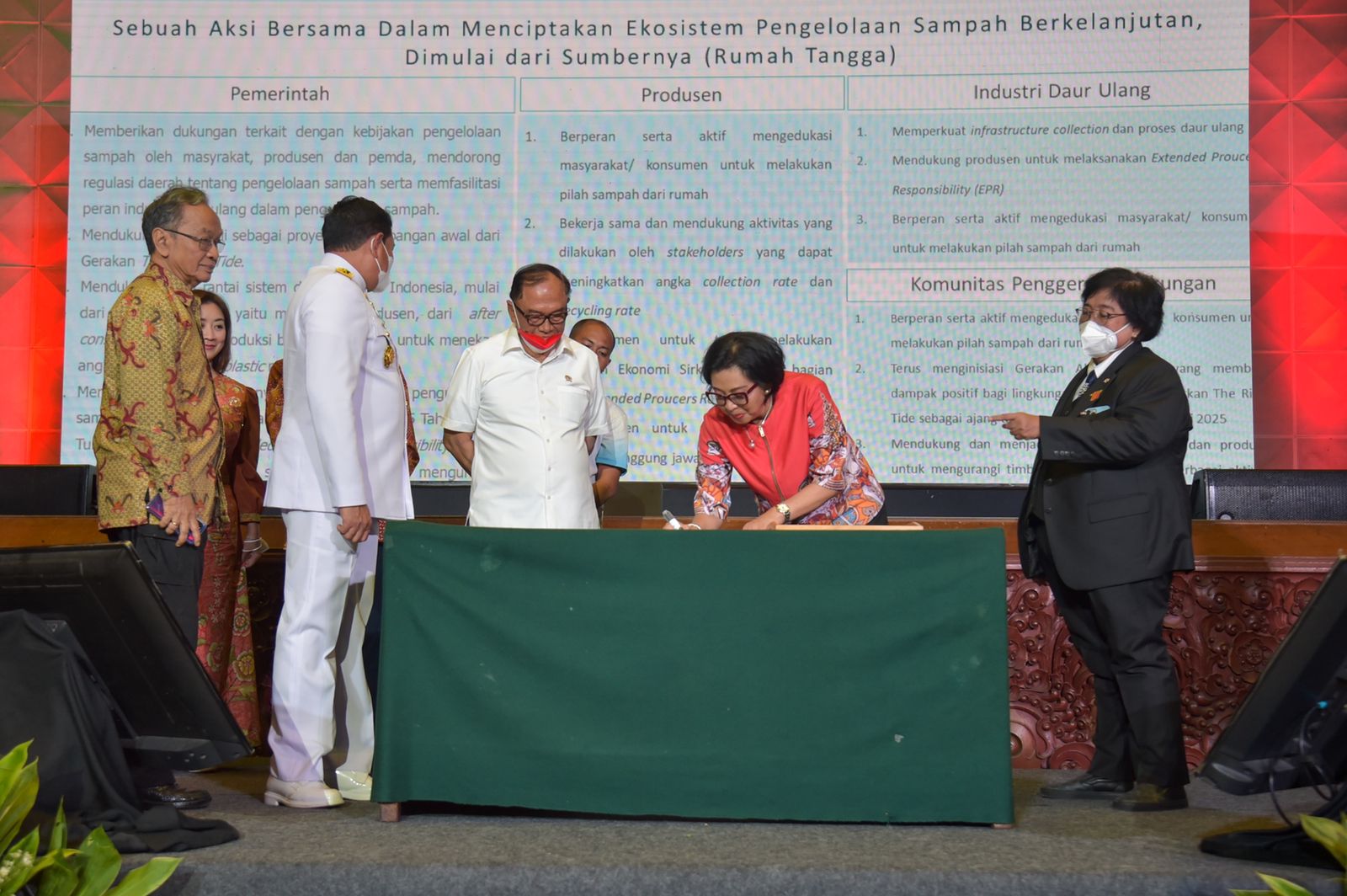 Oleh karena itu untuk menguatkan kerjasama para pihak dari level tapak hingga ke pemerintah pusat, pada kesempatan ini ditandatanganilah komitmen bersama antara Pemerintah, Produsen, Industri Daur Ulang, dan Komunitas Penggerak Lingkungan untuk membentuk ekosistem pengelolaan sampah berkelanjutan dimulai dari sumbernya (rumah tangga) yang ditandatangani oleh Dirjen Pengelolaan Sampah Limbah dan B3 KLHK, dengan Director of Sustainability Mayora Group, disaksikan oleh Menteri LHK Siti Nurbaya, Wantimpres Sidarto Danusubroto, KSAL RI Laksamana TNI Yudo Margono, dan Muryansyah.