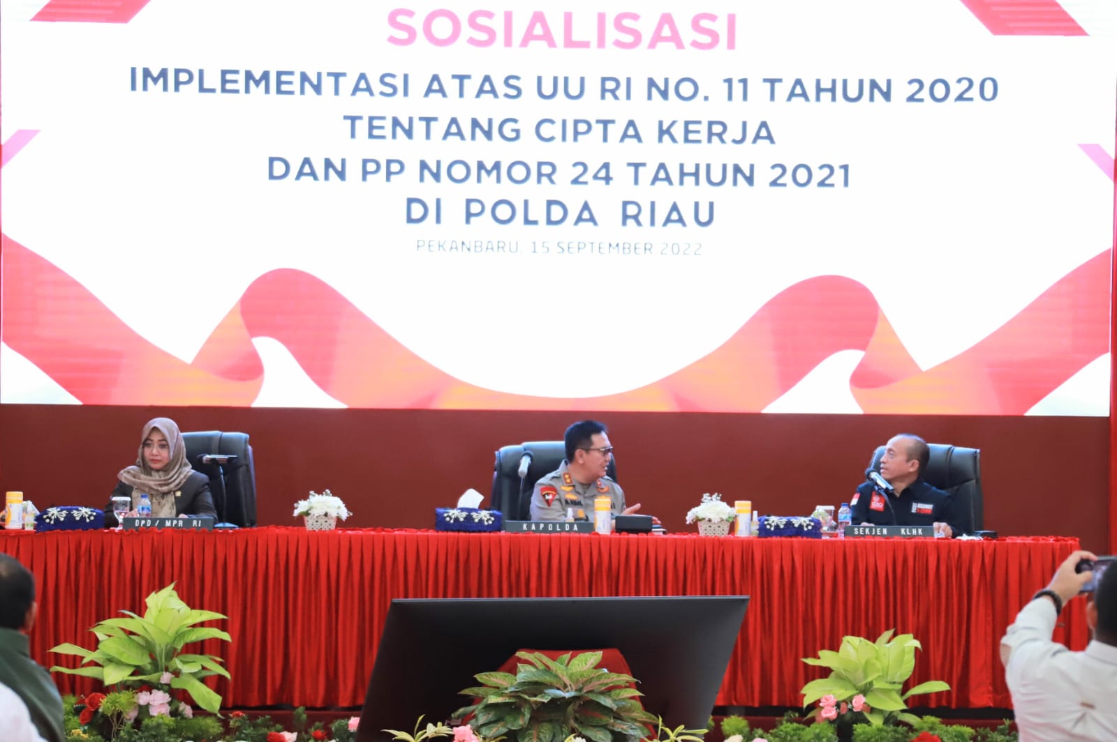 Hal ini ditegaskan Sekjen KLHK, Bambang Hendroyono, dalam sosialisasi implementasi UU Cipta Kerja nomor 11 tahun 2020 dan PP 24 tahun 2021 di Polda Riau. Hadir dalam kegiatan ini Kapolda Riau, seluruh Polres, swasta, anggota DPD RI Instiawati Ayus dan para pihak terkait lainnya.