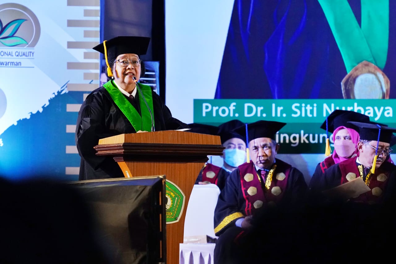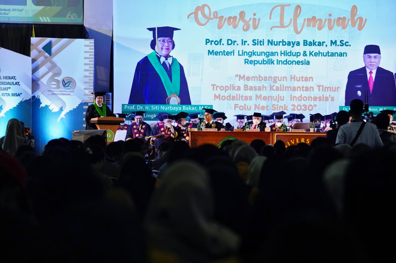 Sementara, orasi ilmiah yang disampaikan Menteri Siti berjudul "Membangun Hutan Tropika Basah Kalimantan, Modalitas Menuju Indonesia's Folu Net Sink 2030". Judul orasi ilmiah yang Menteri Siti sampaikan ini, sejalan dengan pola ilmiah pokok Unmul sebagai center of excellence for tropical studies. Saat ini semua aktifitas akademik (intra & ekstra) yang dilakukan Unmul wajib mempelajari berbagai hal yang terkait dengan isu-isu tropis yaitu hutan tropis basah dan lingkungannya. Termasuk semua tema penelitian dosen dan mahasiswa dari berbagai Fakultas wajib berorientasi isu tersebut.