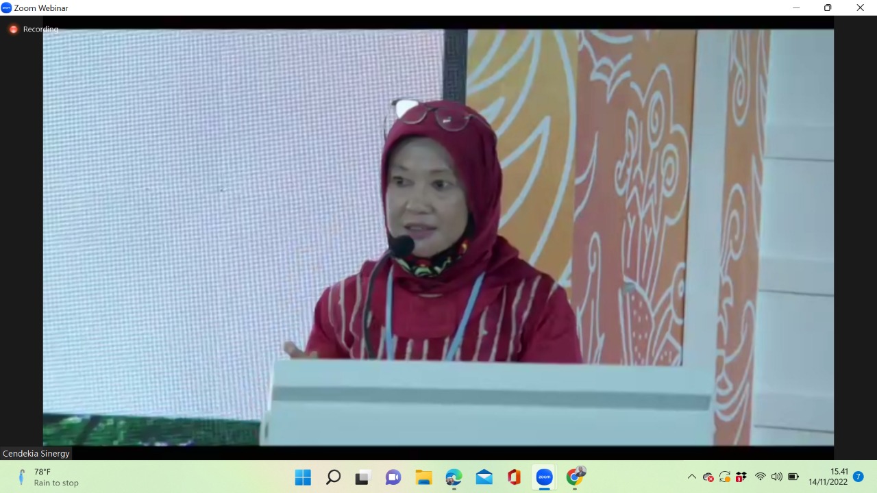”Untuk mencapai target FoLU Net Sink 2030 dan mempercepat perubahan transformasional menuju pembangunan rendah karbon dan ketahanan iklim, Indonesia mengembangkan lima program kerja, yaitu pengelolaan hutan berkelanjutan, peningkatan stok karbon hutan, konservasi hutan alam, pengelolaan lahan gambut, dan membangun instrumen dan informasi," jelas Ary Sudijanto, Kepala Badan Standardisasi Instrumen Lingkungan Hidup (BSILHK), saat membuka sesi Paviliun.