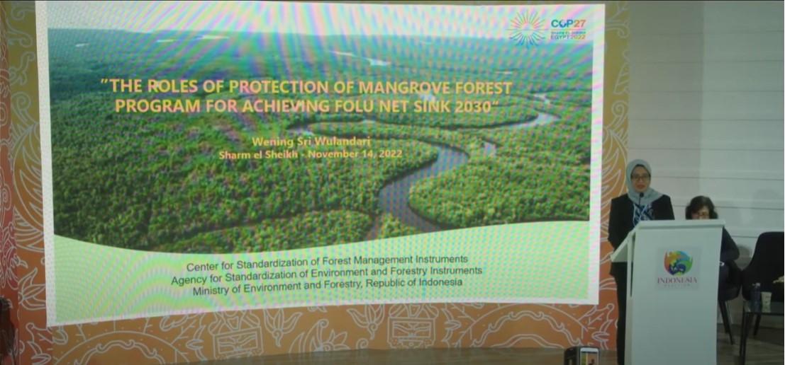 Pusat Standardisasi Instrumen Pengelolaan Hutan Berkelanjutan (Pustarhut) menyelenggarakan talkshow "World Mangrove Center: An Integrated and Sustainable Mangrove Management, International Support for Indonesia's FOLU Netsink 2030" pada salah satu sesi COP27 UNFCCC di Sharm El Sheikh, Mesir, Selasa, 15 November 2022.