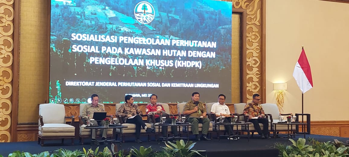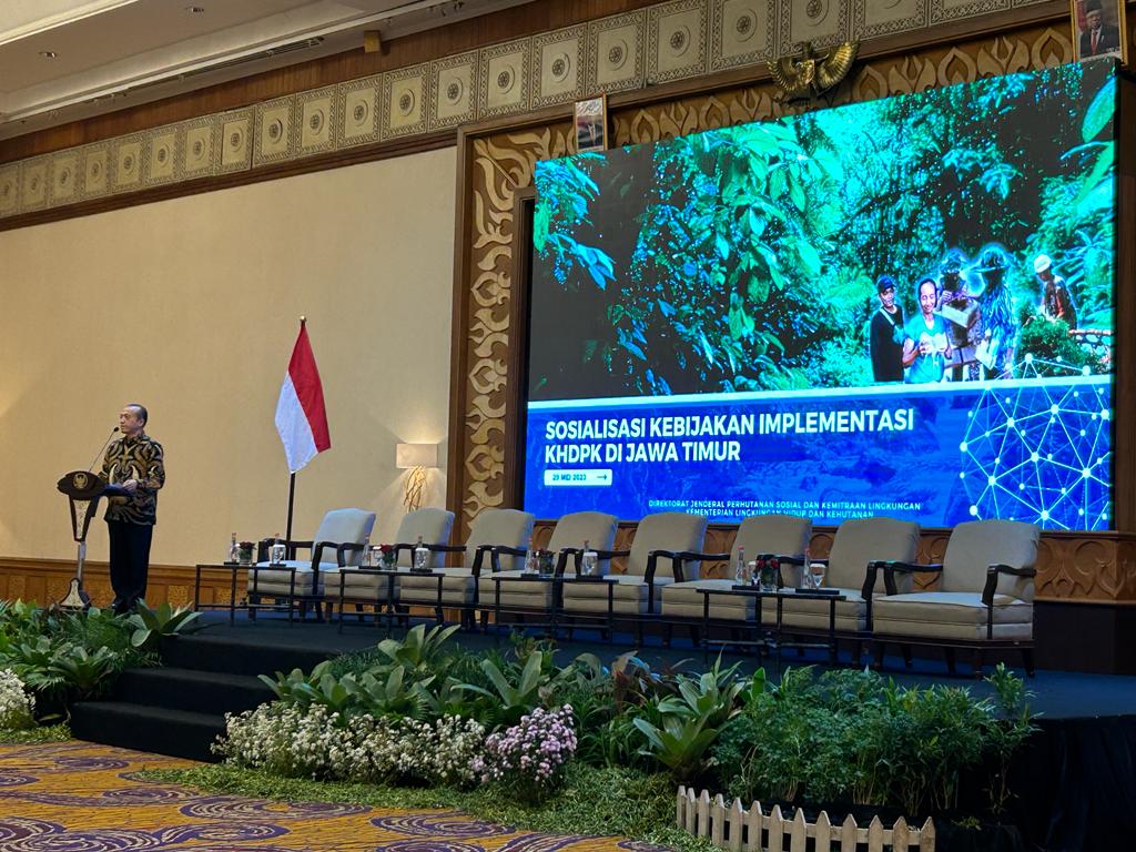 Kementerian Lingkungan Hidup dan Kehutanan (KLHK) menyelenggarakan sosialisasi kebijakan implementasi Kawasan Hutan Dengan Pengelolaan Khusus (KHDPK) di Surabaya, Jawa Timur, Senin (29/5). Sekretaris Jenderal KLHK Bambang Hendroyono membuka secara langsung acara yang digelar secara hybrid ini. Peserta kegiatan ini berasal dari Kementerian Lingkungan Hidup dan Kehutanan, Kementerian BUMN, Perum Perhutani, Pemerintah Daerah, akademisi dan penggiat KHDPK serta penggiat Perhutanan Sosial.