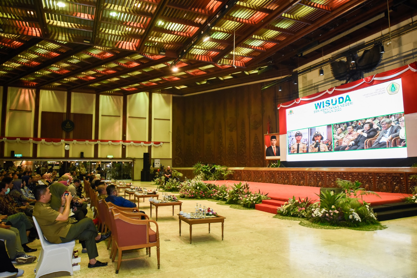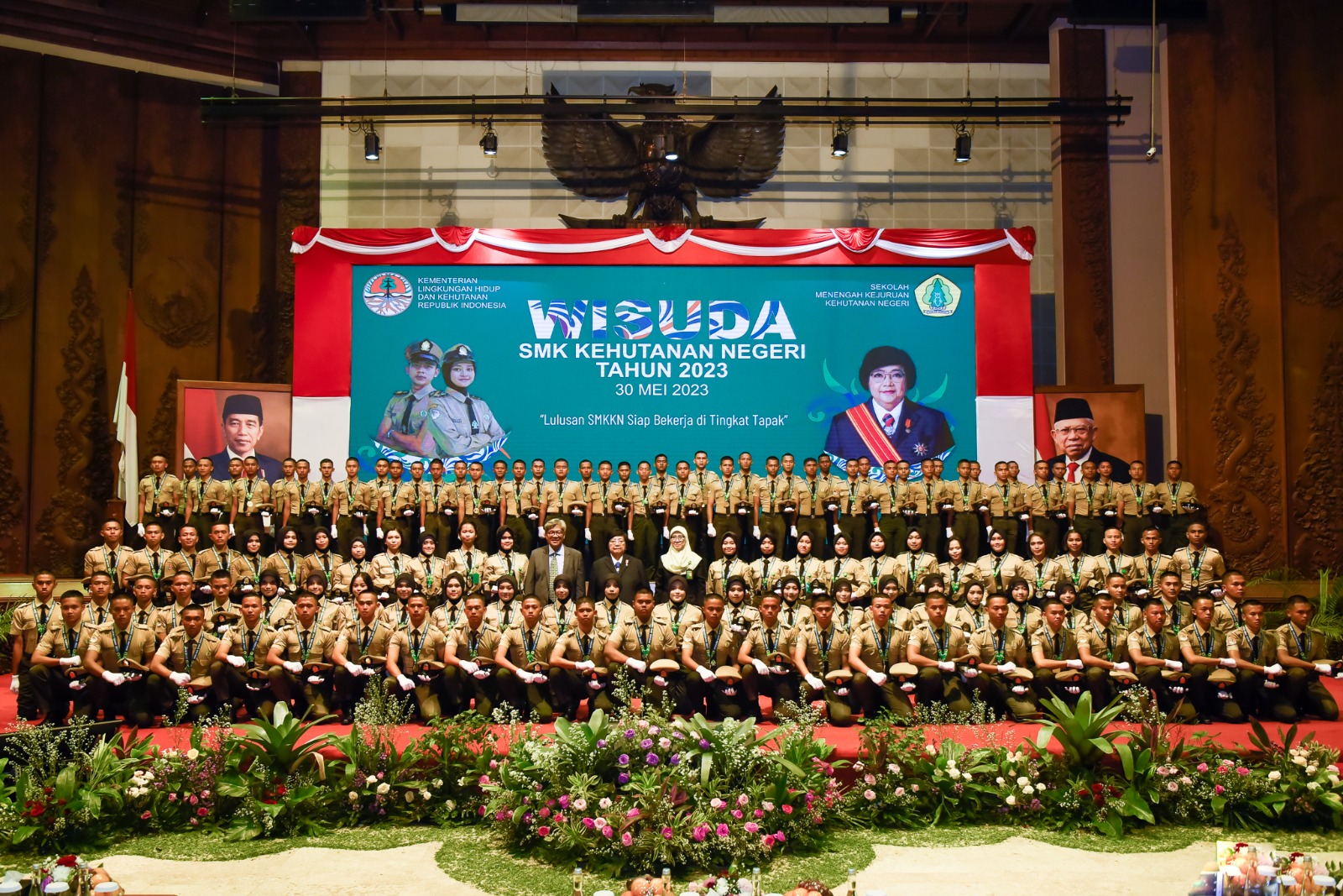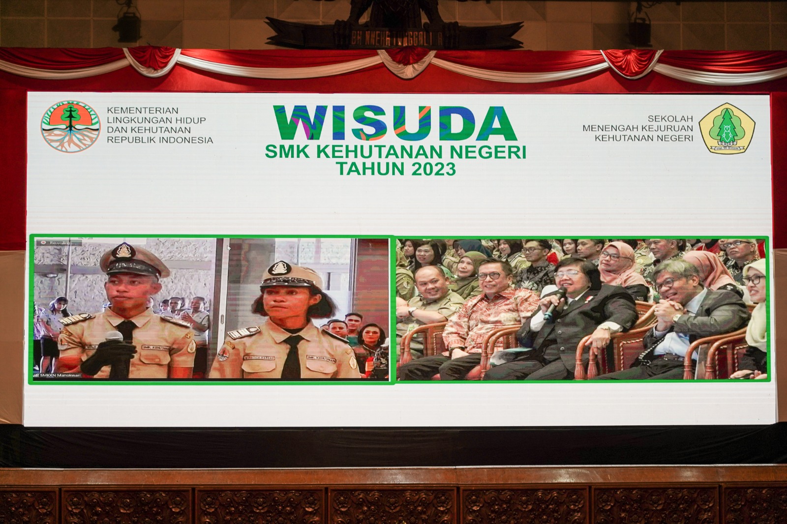 Menteri Lingkungan Hidup dan Kehutanan (LHK) Siti Nurbaya mewisuda 472 siswa lulusan Sekolah Menengah Kejuruan Kehutanan Negeri (SMKKN) Tahun 2023 secara hybrid di Jakarta, Selasa (30/5). Seluruh peserta wisuda ini berasal dari SMKKN yang tersebar di lima wilayah di Indonesia yaitu Pekanbaru, Kadipaten, Samarinda, Makassar dan Manokwari.