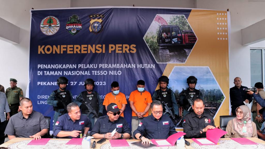 Dalam Konferensi Pers yang dilaksanakan Selasa (27/06) di Pekanbaru, Subhan, Kepala Balai Gakkum KLHK Wilayah Sumatera, mengatakan bahwa kedua tersangka TMM (40) dan R (30) dijerat dengan Undang-Undang Nomor 5 Tahun 1990 tentang Konservasi Sumber Daya Alam Hayati dan Ekosistemnya, Undang-Undang Nomor 18 Tahun 2013 tentang Pencegahan dan Pemberantasan Perusakan Hutan sebagaimana telah diubah dengan Pasal 37 angka 16 Undang Undang Nomor 6 Tahun 2023 tentang Penetapan Peraturan Pemerintah Pengganti Undang–Undang Nomor 2 Tahun 2022 tentang Cipta Kerja menjadi Undang-Undang, pelaku perambahan diancam pidana penjara paling lama 10 tahun dan denda paling banyak Rp.5 miliar.