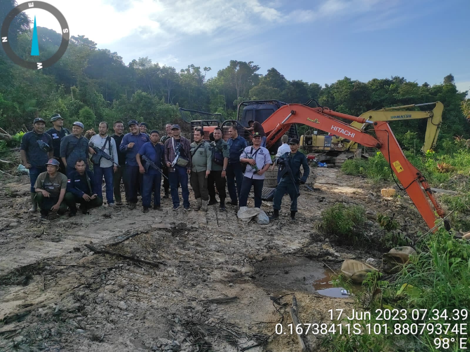 Operasi Gabungan KLHK kembali menangkap dua pelaku perambahan di Kawasan Hutan Konservasi Taman Nasional Tesso Nilo (TNTN) berinisial TMM (40) dan R (30), serta mengamankan barang bukti berupa 1 unit alat berat warna jingga dan 1 unit sepeda motor warna hitam, tanggal 17 Juni 2023, di KM 86 Resort Lancang Kuning, Taman Nasional Tesso Nillo, Desa Lubuk Kembang Bunga, Kecamatan Ukui, Kabupaten Pelalawan, Provinsi Riau. Operasi ini dilakukan dalam rangka peningkatan pengamanan TNTN.