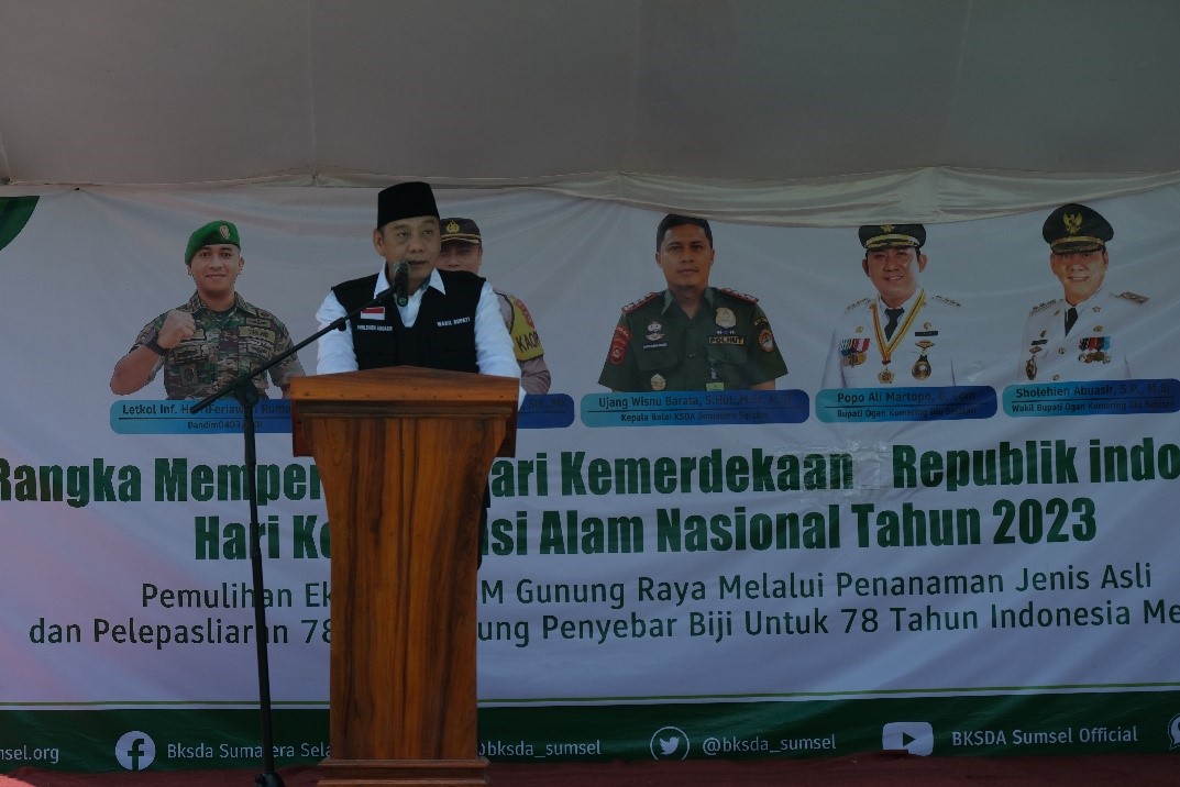 Balai Konservasi Sumber Daya Alam (BKSDA) Sumatera Selatan berkolaborasi dengan Pemerintah Kabupaten (Pemkab) Ogan Komering Ulu (OKU) Selatan melakukan penanaman pohon jenis asli dan pelepasliaran 78 ekor burung penyebar biji di kawasan Suaka Margasatwa (SM) Gunung Raya Kabupaten OKU Selatan pada Kamis (10/08). Pelaksanaan kegiatan ini bertepatan dengan peringatan Hari Konservasi Alam Nasional (HKAN) yang diperingati setiap tanggal 10 Agustus tahun 2023, serta dalam rangka menyambut Hari Ulang Tahun Kemerdekaan Republik Indonesia ke-78.