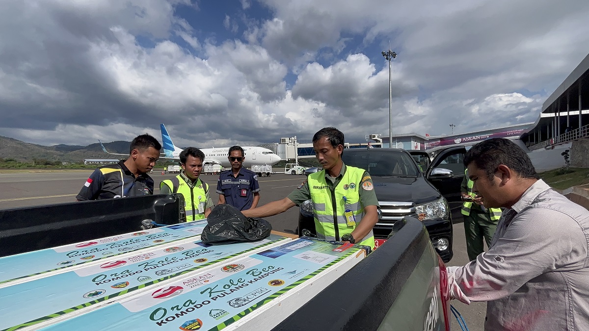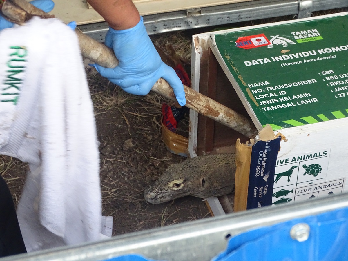 Enam individu satwa Komodo (Varanus komodoensis) tiba di kampung halamannya Labuan Bajo, Nusa Tenggara Timur pada hari Selasa (15/8/2023). Enam komodo yang berasal dari Lembaga Konservasi Taman Safari Indonesia (TSI) - Bogor ini, diberangkatkan menggunakan fasilitas kargo Garuda Indonesia nomor penerbangan GA 0452 dari bandara Soekarno Hatta pukul 11.40 WIB, dan tiba di Bandara Komodo-Labuan Bajo pukul 14.30 WITA. Keenam satwa ini selanjutnya akan menjalani proses habituasi selama satu bulan di CA Wae Wuul sebelum dilepasliarkan pada pertengahan September 2023 mendatang.
