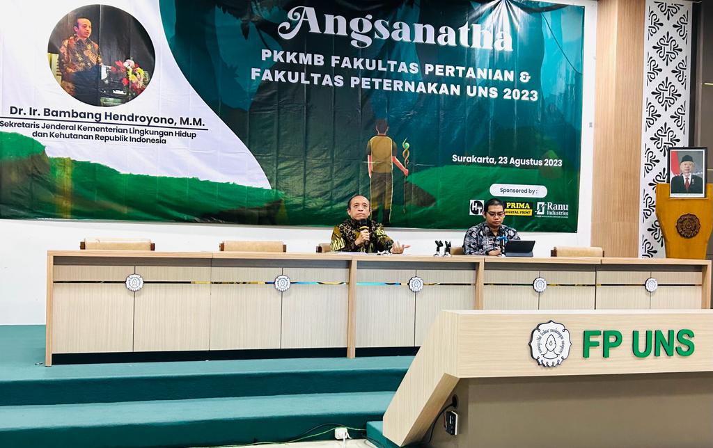 Sekretaris Jenderal Kementerian Lingkungan Hidup dan Kehutanan (KLHK), Bambang Hendroyono mengisi kuliah umum bagi mahasiswa baru di Universitas Sebelas Maret di Solo, Jawa Tengah. Rabu, (23/08/2023).