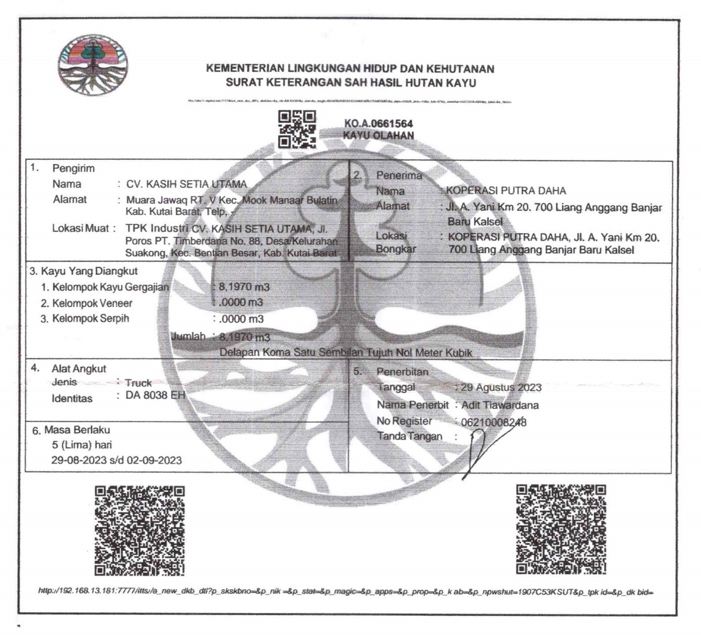 Tim melakukan menghentian truk tersebut kemudian melakukan pemeriksaan dokumen SKSHHK-KO dan benar ternyata lokasi pemuatan kayu olahan tidak sesuai dengan dokumennya dan tidak sesuai dengan dokumen yang ada di aplikasi SIPUHH Kementerian LHK. Selanjutnya tim melakukan pengamanan terhadap pelaku dan barang bukti untuk diserahkan kepada Penyidik untuk proses hukum lebih lanjut.