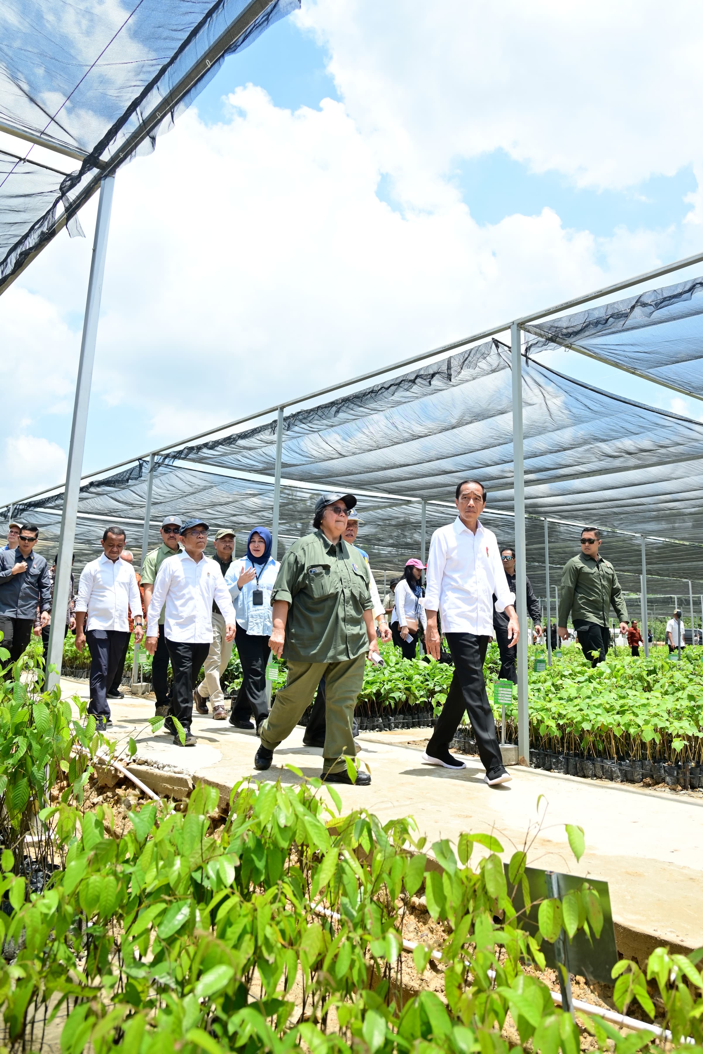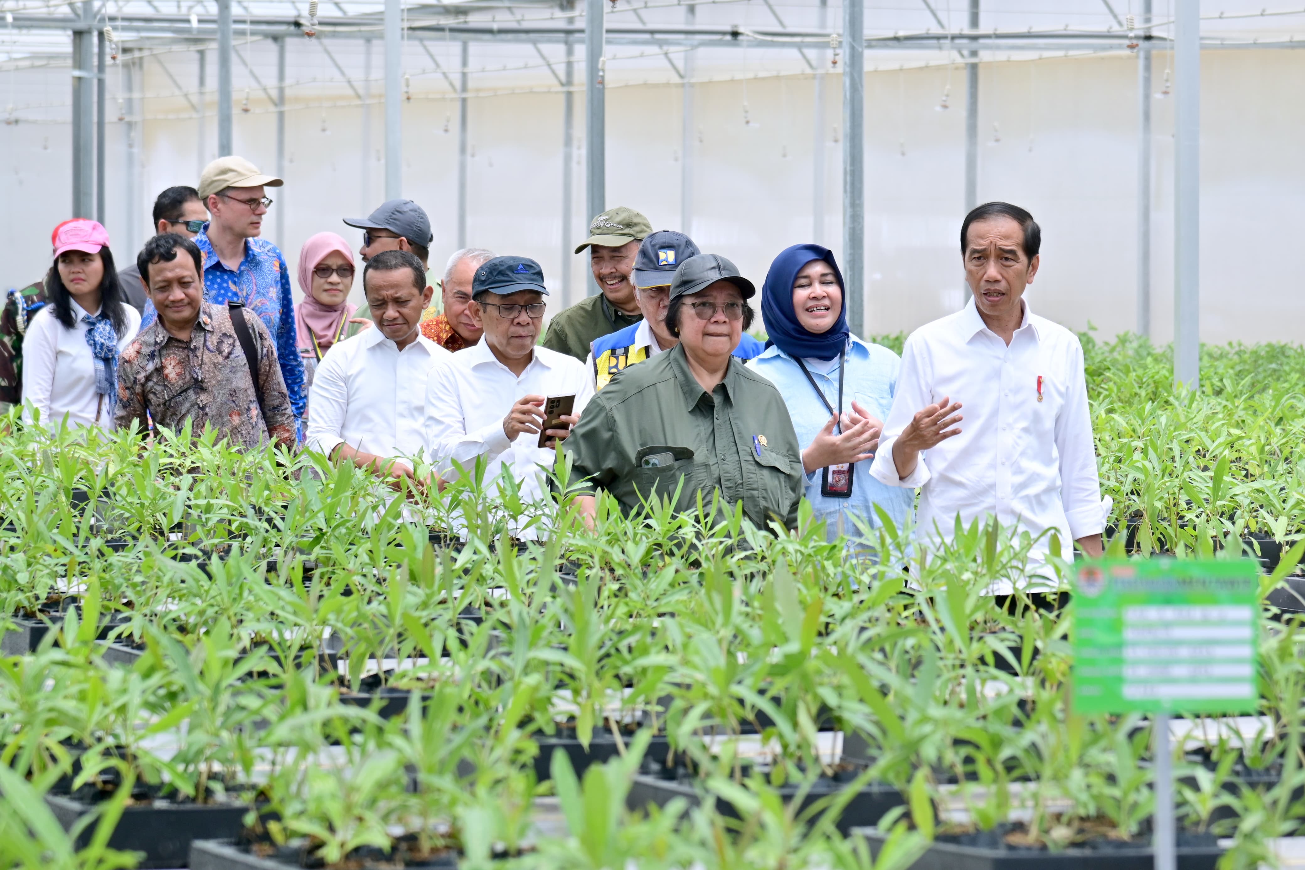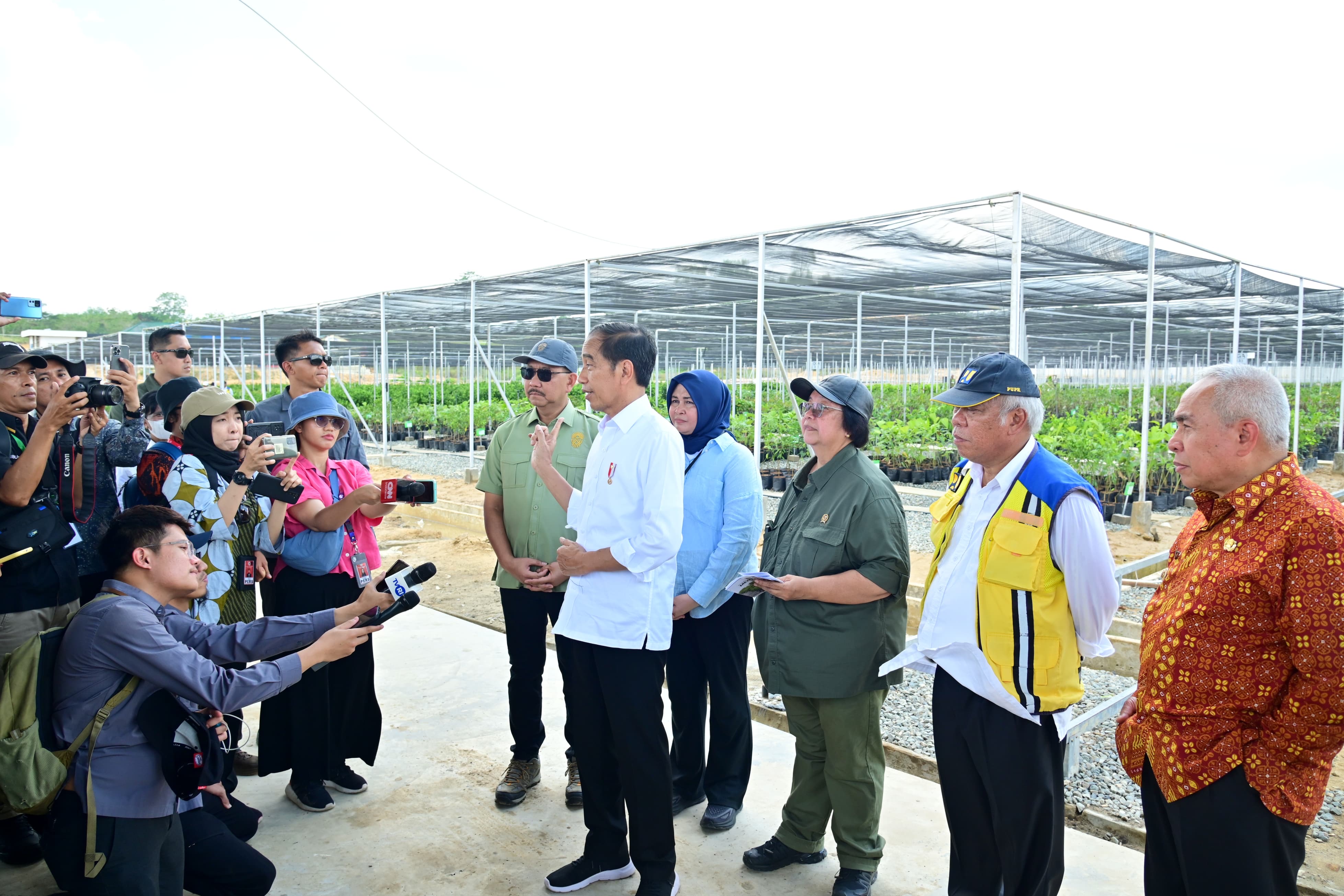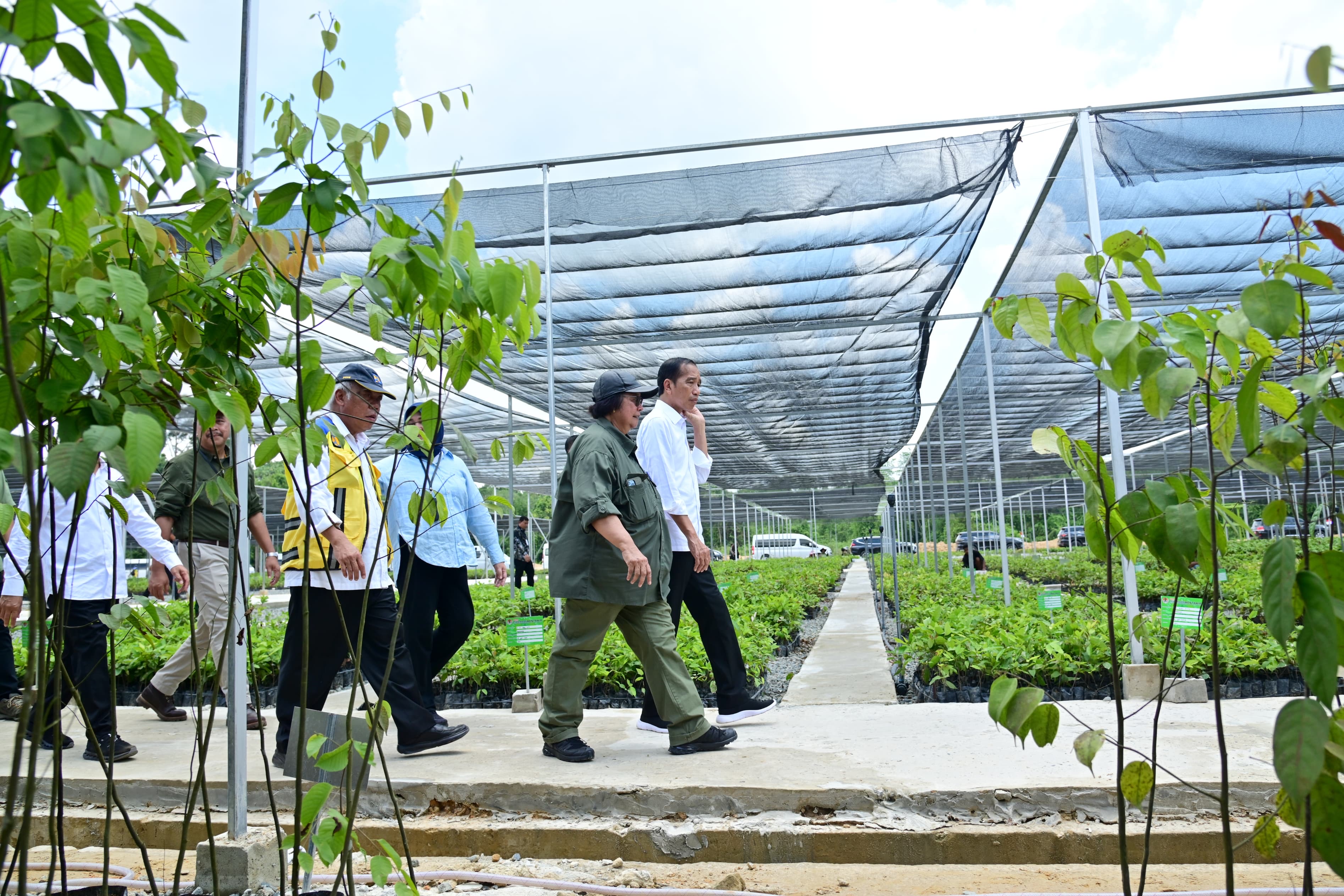 Presiden Joko Widodo, didampingi Menteri Lingkungan Hidup dan Kehutanan (LHK), Siti Nurbaya meninjau perkembangan pembangunan Persemaian Mentawir, di Provinsi Kalimantan Timur (21/09/2023). "Dulu kita masuk sini masih belum kelihatan, tapi sekarang sudah hampir 100 persen, tinggal rapi-rapi," ucap Presiden Joko Widodo kepada awak media.
