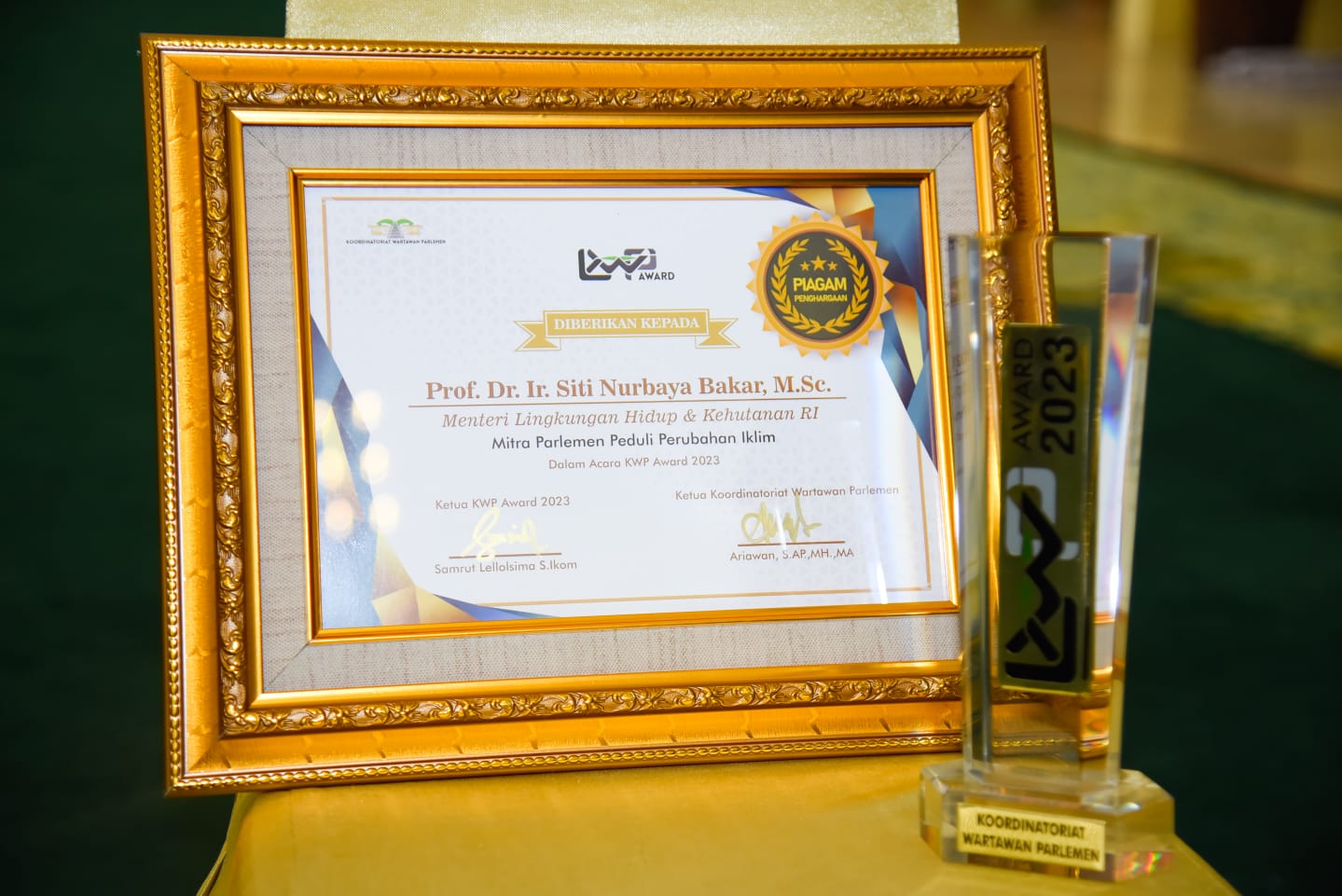 Menteri Lingkungan Hidup dan Kehutanan (LHK), Siti Nurbaya menerima penghargaan dari Koordinatoriat Wartawan Parlemen (KWP) atas kontribusinya sebagai mitra parlemen yang bekerja keras dalam upaya pengendalian perubahan iklim. Bertempat di Ruang Pustakaloka, Gedung Nusantara V kompleks MPR DPR RI (02/10/2023), Direktur Jenderal Pengelolaan Sampah Limbah dan B3, Rosa Vivien Ratnawati hadir mewakili Menteri LHK untuk menerima penghargaan.