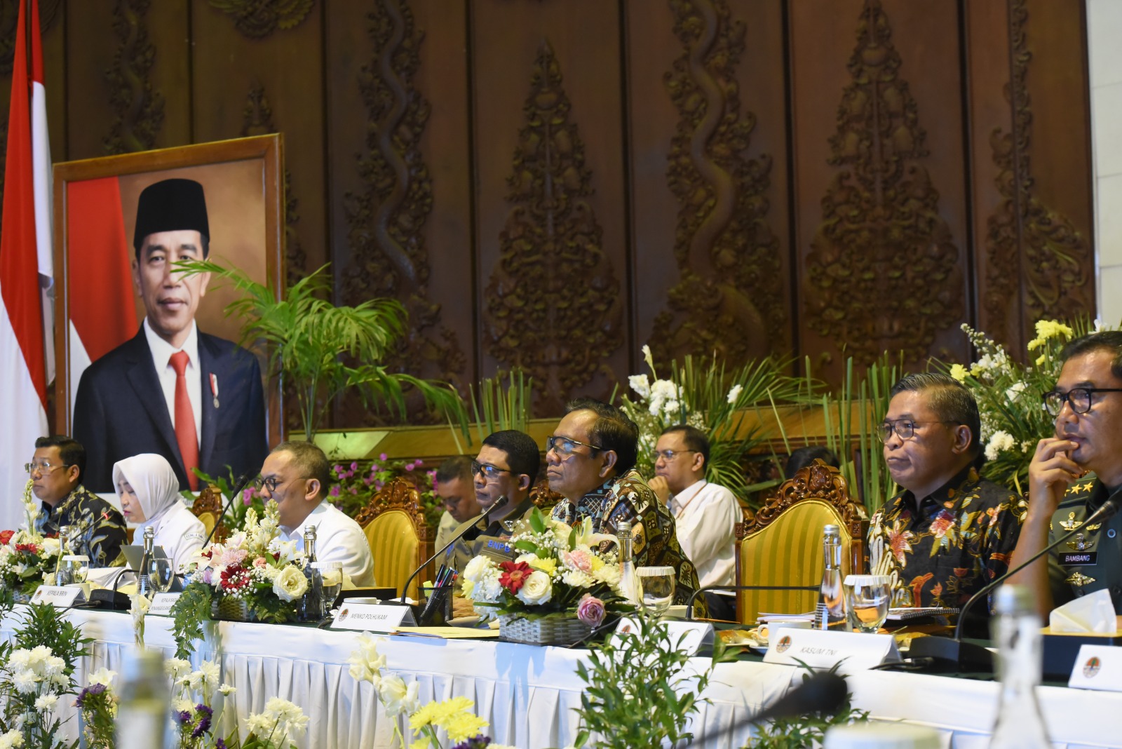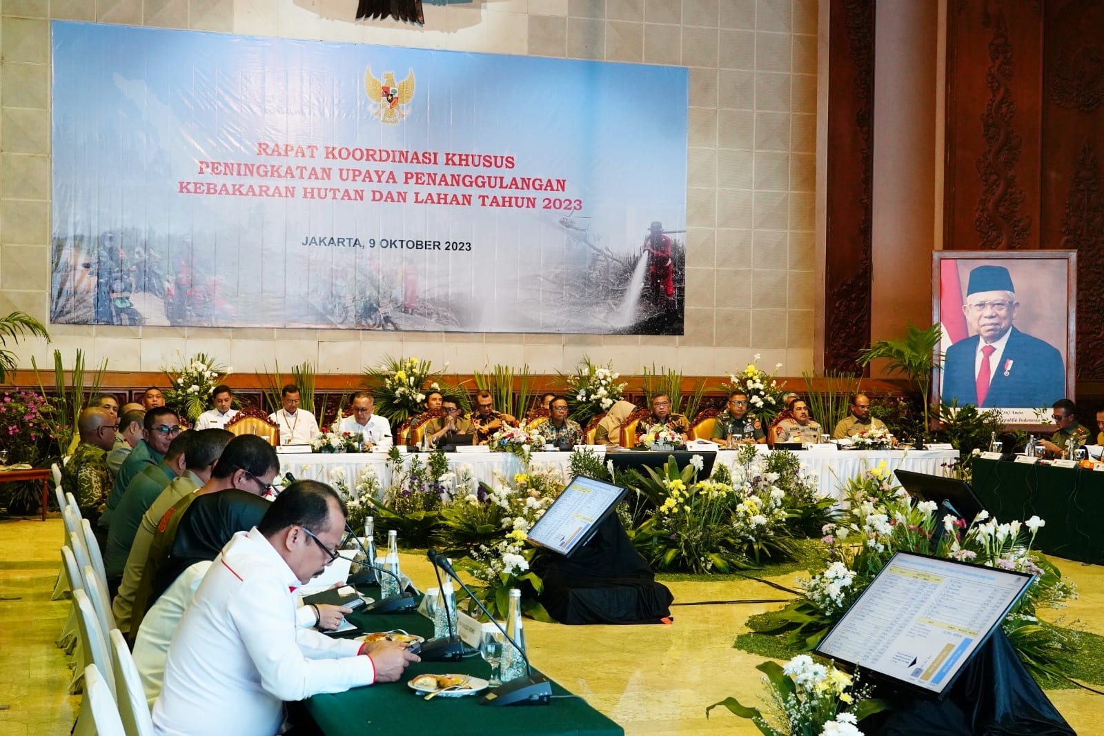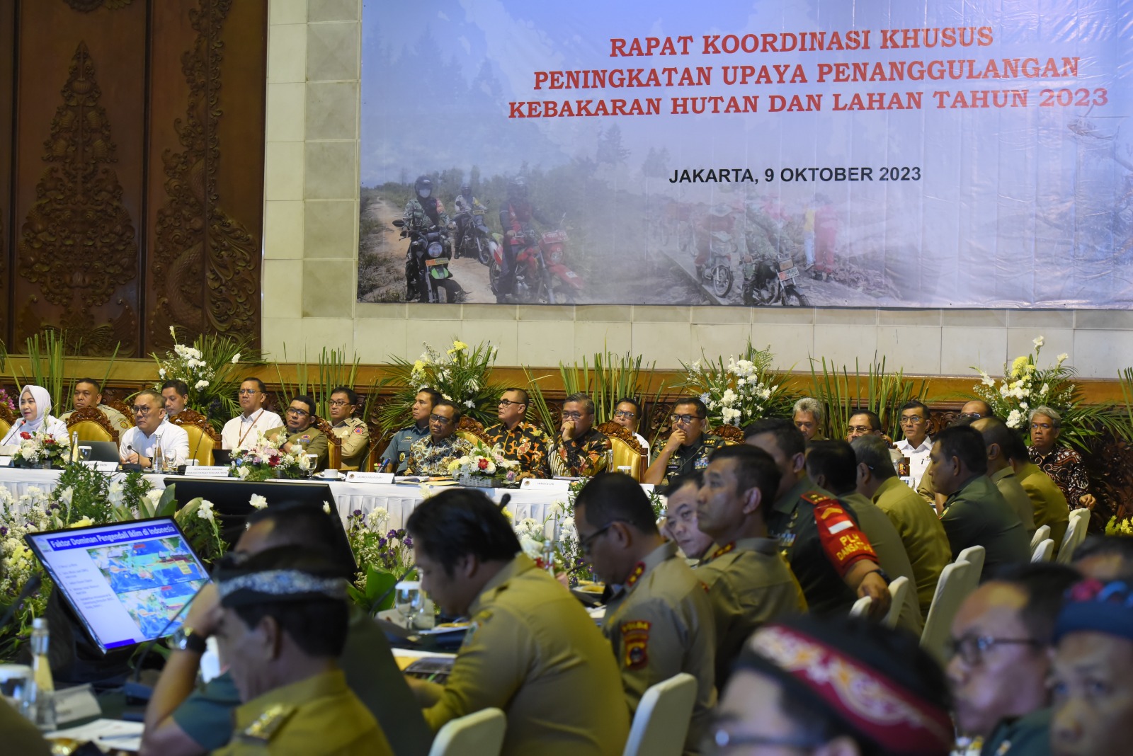 Menteri Koordinator Bidang Politik, Hukum, dan Keamanan (Menko Polhukam), Mahfud MD memimpin langsung Rapat Koordinasi Khusus (Rakorsus) Peningkatan Upaya Penanggulangan Karhutla pada Masa El Nino Tahun 2023 di Manggala Wanabakti, Jakarta, Senin (09/10/2023). Peserta rapat terdiri dari para Menteri dan Kepala Lembaga, Gubernur wilayah rawan karhutla beserta Pangdam/Danrem dan Kapolda, Kepala Kejaksaan Tinggi, para pelaksana teknis lapangan BPBD, serta para Kepala UPT Kementerian LHK.